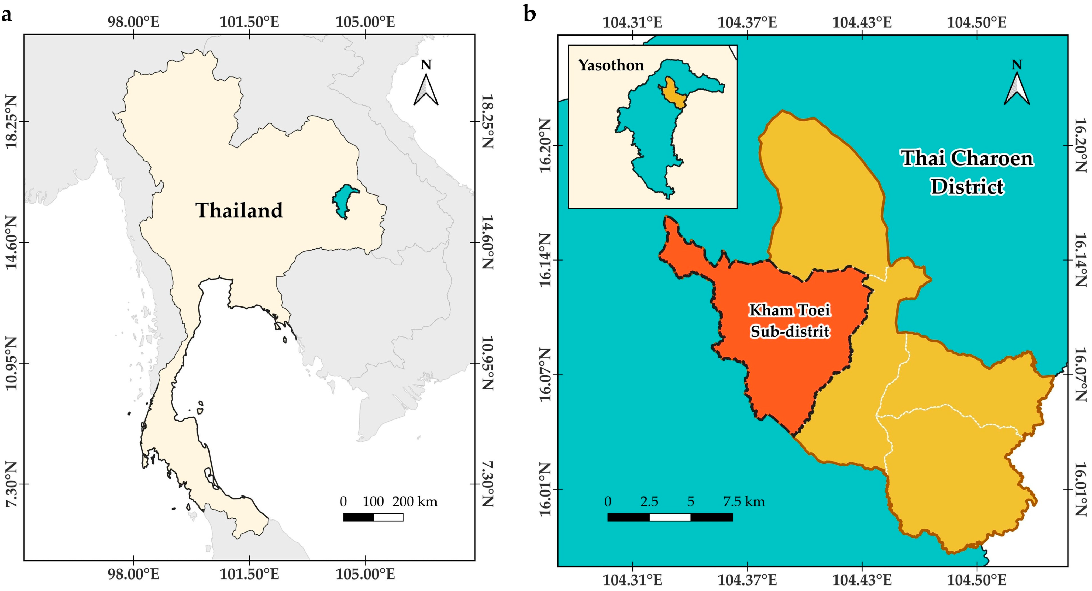 This study focuses on Kham Toei Sub-district, located in Thai Charoen District, Yasothon Province, in northeastern Thailand (Figure 1). The sub-district is known for its rich cultural heritage, agricultural traditions, and vibrant community life, making it an ideal location for investigating the ornamental cultural significance in local practices.