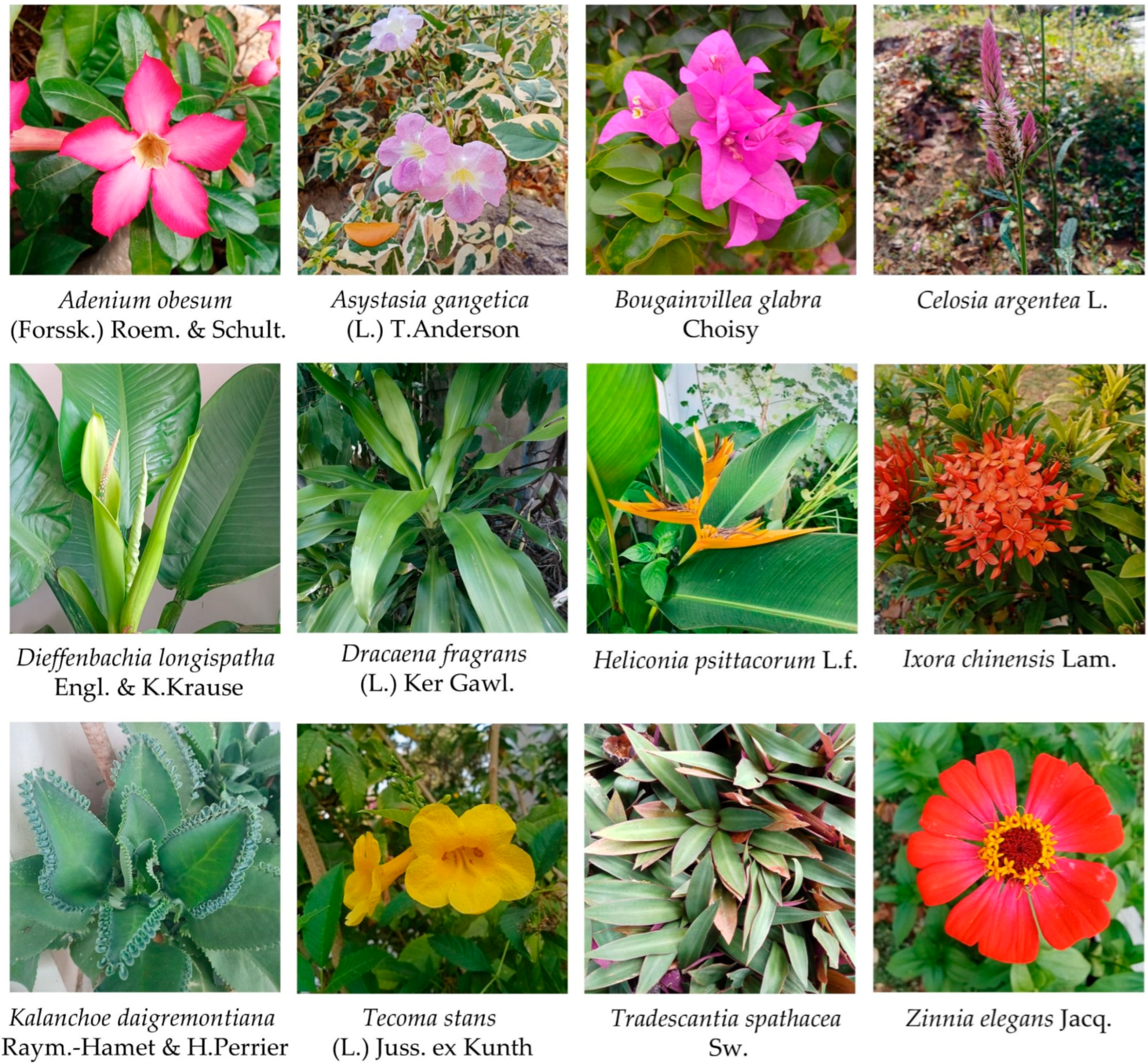 A total of 81 species of ornamental plants were recorded, belonging to 66 genera and 36 families (Figure 2 and Figure 3 and Table S2). The family Araceae was represented by the highest number of species (12 species), followed by Asparagaceae with 8 species, Apocynaceae with 7 species, Euphorbiaceae with 6 species, and Fabaceae with 5 species. Families such as Amaryllidaceae, Arecaceae, and Asteraceae each represented by three species. Six families, namely Acanthaceae, Commelinaceae, Crassulaceae, Polypodiaceae, Rubiaceae, and Zingiberaceae, were represented by 2 species each. The remaining 24 families contained only a single species.