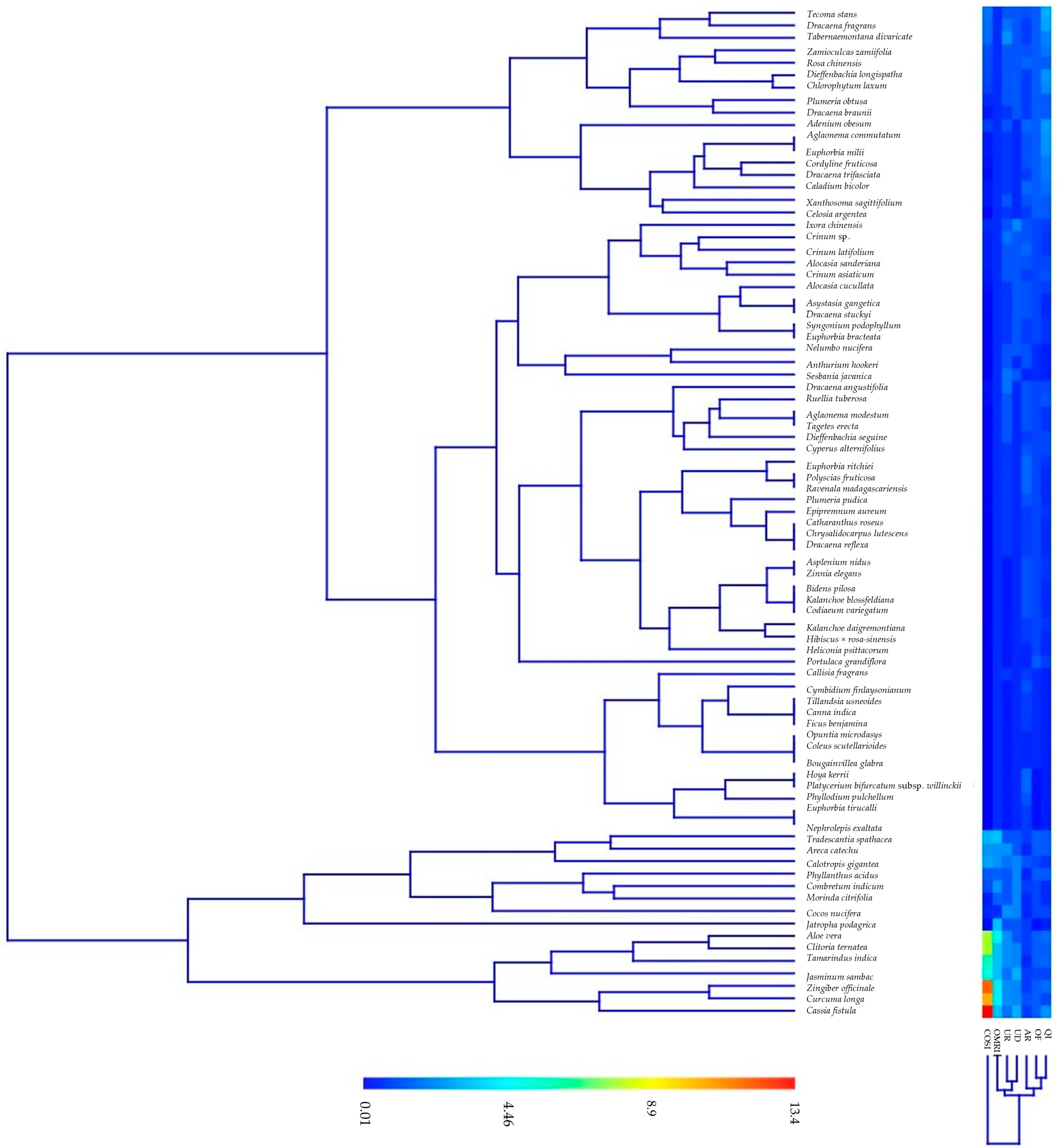 To explore and illustrate the variation in Cultural Ornamental Significance Index (COSI) values among ornamental plant species recorded in Kham Toei Sub-district, the Unweighted Pair Group Method with Arithmetic Mean (UPGMA) [28] was employed. The data matrix was analyzed using the UPGMA clustering algorithm, and the relationships among the recorded species were visualized as a heatmap generated with PAST4 software (version 4.15). This analytical approach facilitated a comparative evaluation of COSI patterns and ornamental plant diversity within the study area.