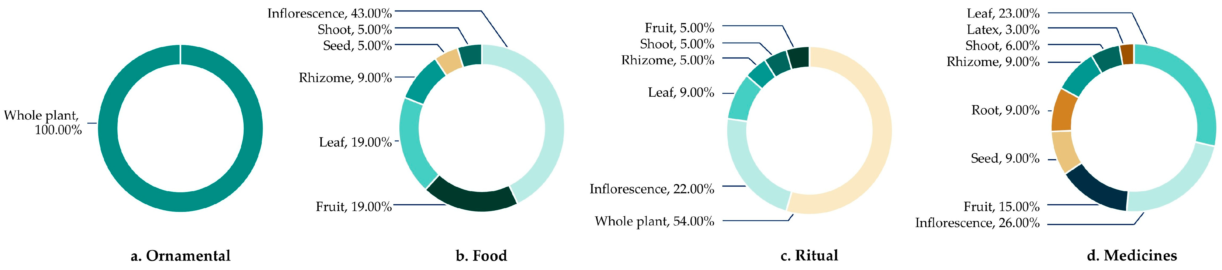 Figure 5. Percentage distribution of plant parts used across four categories of ethnobotanical applications. The figure includes four pie charts showing the relative use of different plant parts for: (a) ornamental, (b) food, (c) ritual, and (d) medicines.