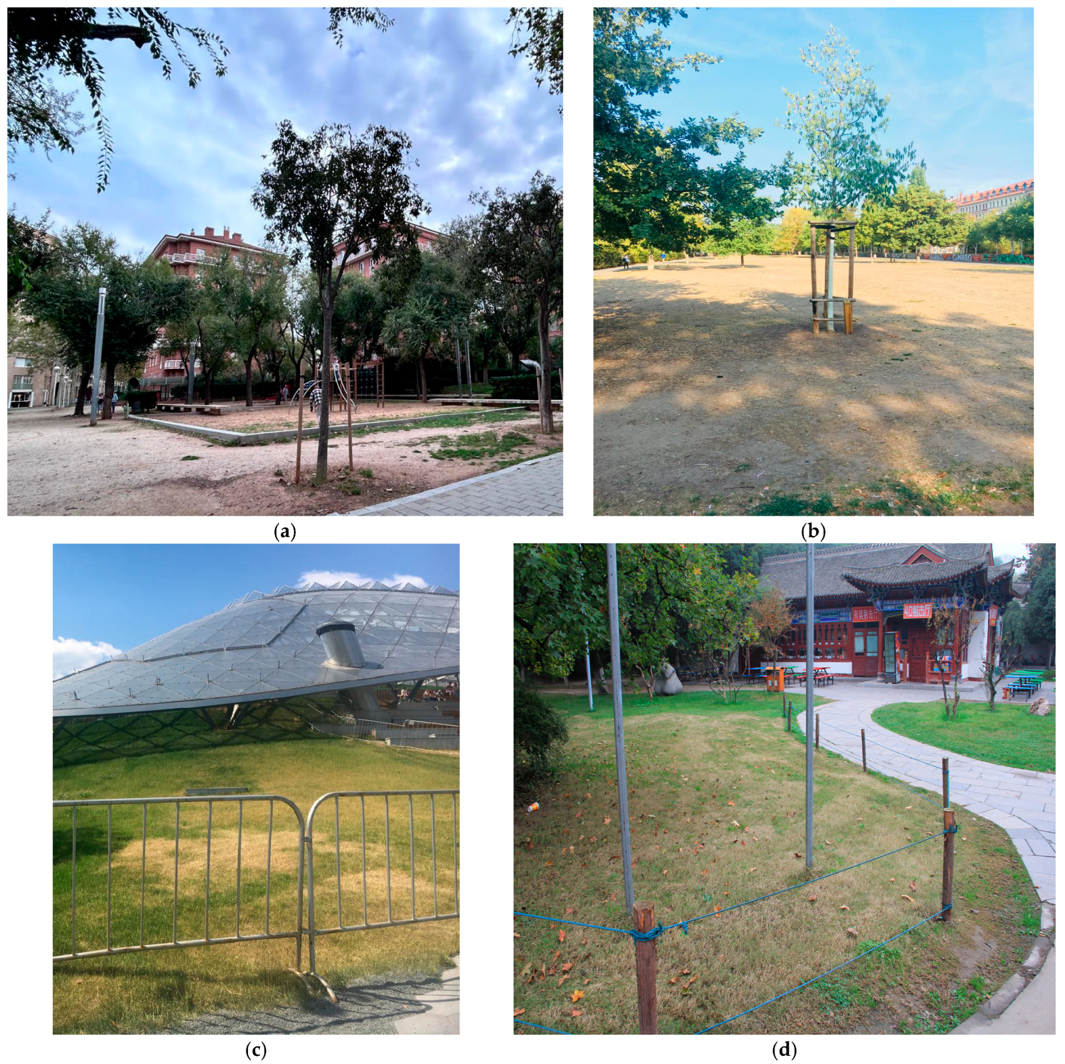 - Amani-Beni, M.; Zhang, B.; Xie, G.; Xu, J. Impact of urban park’s tree, grass, and waterbody on microclimate in hot summer days: A case study of Olympic Park in Beijing, China. Urban For. Urban Green. 2018, 32, 1–6. [Google Scholar] [CrossRef]