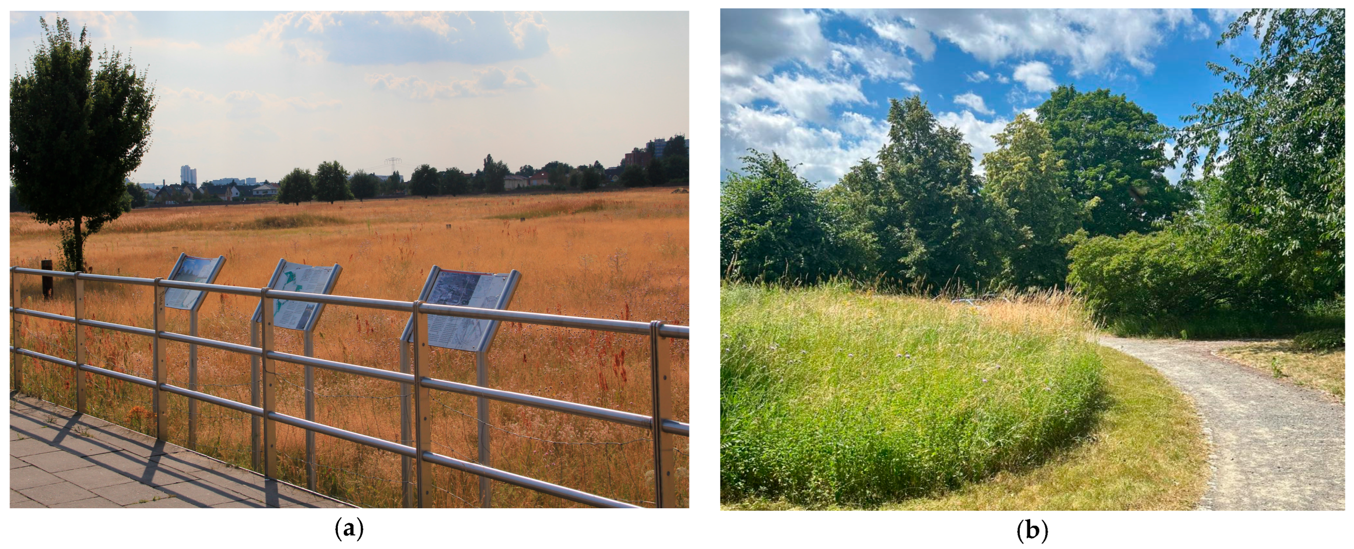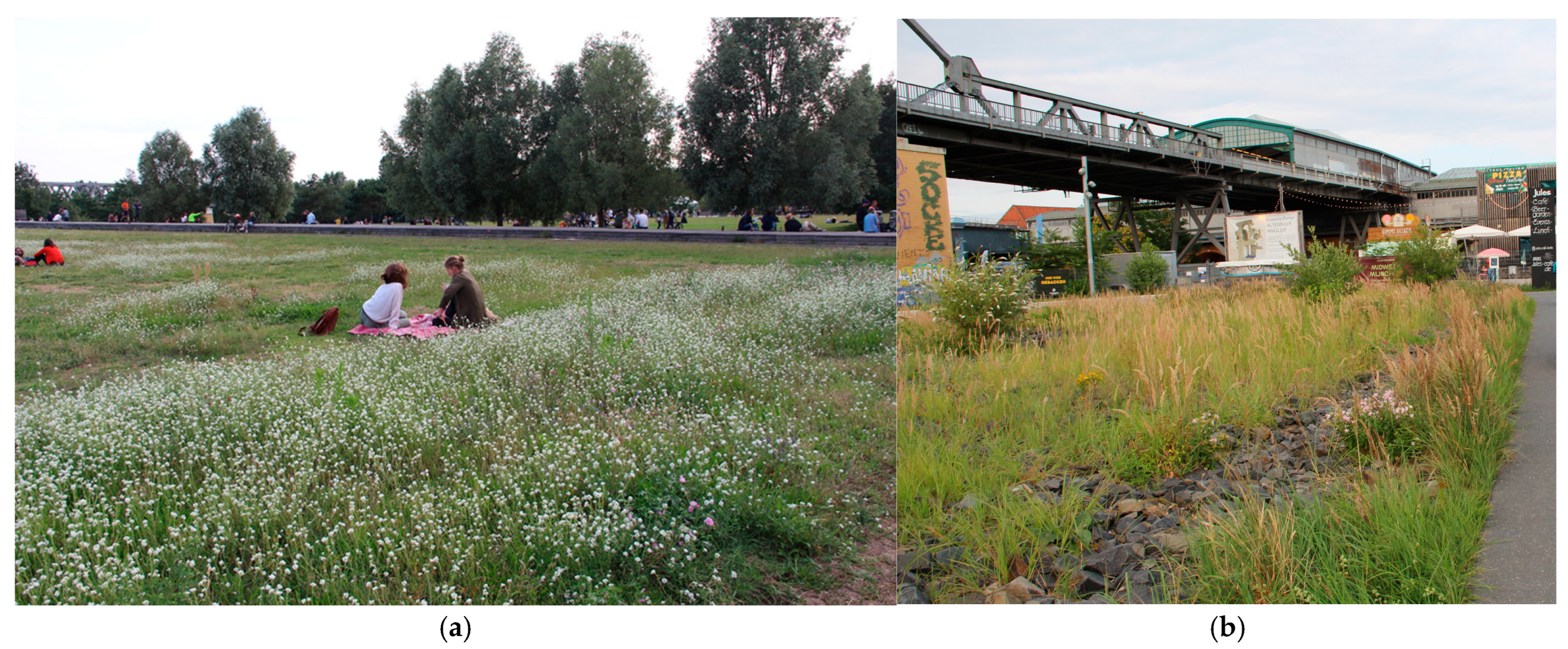 | (1) Urban semi-natural grasslands (Figure 9) | Ecological (support original flora/fauna (pollinators)) | Carbon sequestration, erosion control | Remnants of historically natural or semi-natural grasslands, or areas managed to mimic them. Rich variety of native wildflowers and grasses that developed over time. Mowing once or twice per year or grazing; no irrigation; adaptive to local soil and climate | Leipzig, Rome, Berlin | [34,38,39,81,83,95,131,136,139,140] |