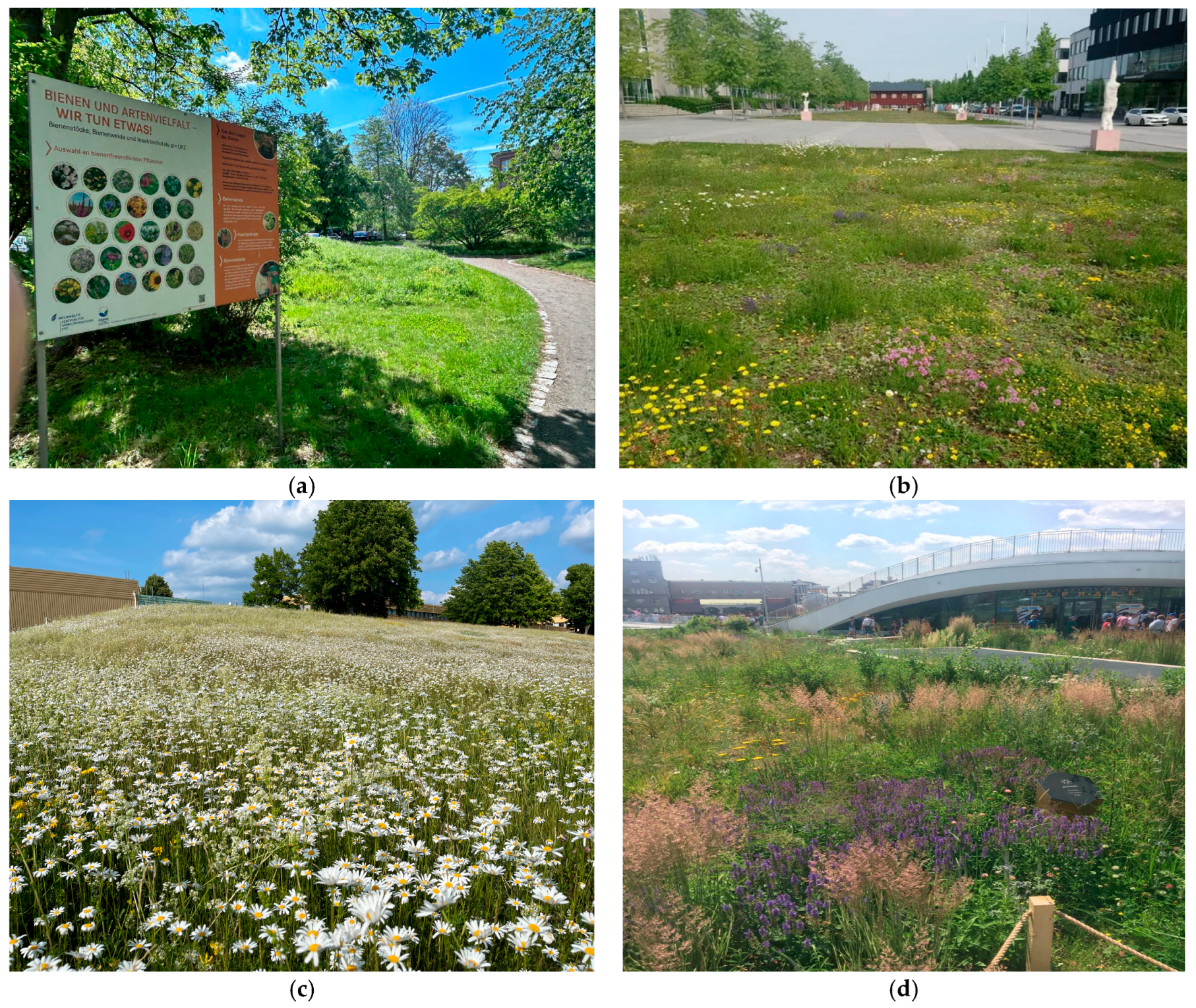 - Pictorial (annual) meadows are created from native and exotic annual plants, providing colourful flowering sites that are also highly attractive to wildlife. They are found on university campuses and public parks in Stockholm and Uppsala. In Berlin and Leipzig, pictorial and wildflower meadow pilots have been implemented as part of municipal greening campaigns. In Germany, such meadows are often called Blühwiesen (the same as urban species-rich meadows—type 1) (Figure 15).