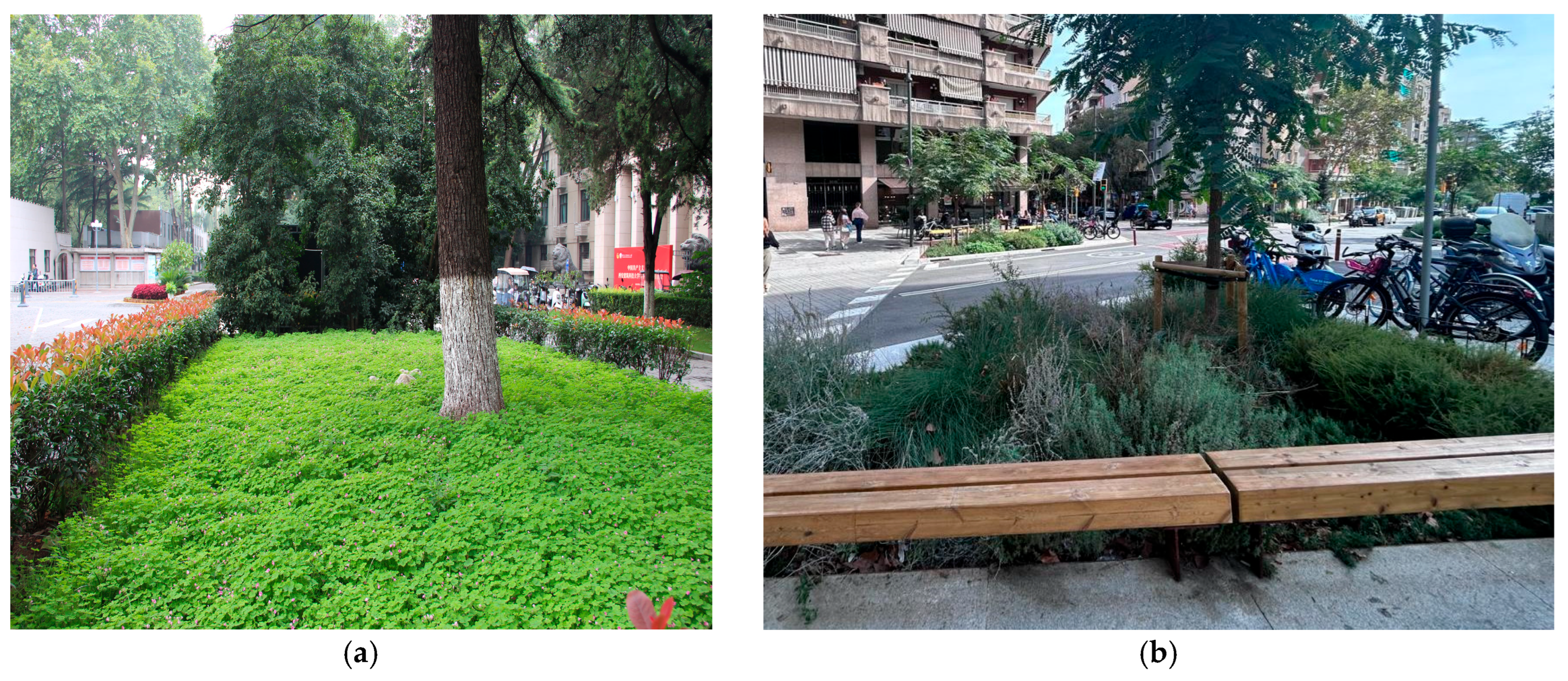 - Mixed-vegetation groundcovers are low-growing plant assemblages (grasses, forbs, and herbs) designed to replace conventional lawns in some particular parts of urban green spaces. They provide continuous ground cover, often similar in appearance to uniform lawns, while enhancing biodiversity, providing pollinator habitat, and protecting soils. Case studies in Moscow and St. Petersburg show the shift of public preference for a mix of cultivated and spontaneous plants, highlighting that the success of groundcovers depends on balancing ecological aesthetics with public perception of “wildness” and maintenance. Plant composition varies depending on climatic conditions—northern cities such as Uppsala, Stockholm, and St. Petersburg, as well as Moscow, tend to use low-growing perennial groundcover species. In contrast, Barcelona and Rome favour mixed-vegetation groundcovers using drought-tolerant Mediterranean groundcovers. In Chinese cities, shade-tolerant native species are used, e.g., in demonstration gardens on the Xi’an University campus (Figure 13).