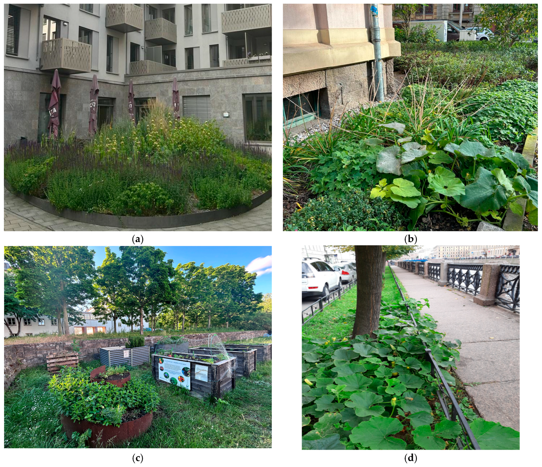 | (6) Edible lawn alternatives (Figure 14) | Food production and multifunctionality | Pollinator habitat, soil health, urban microclimate benefits | Often permaculture-inspired: low or no mowing, diverse edible species; some irrigation may be needed; maintenance depends on species selection | Berlin, Leipzig, Moscow, St. Petersburg | [11,51,57,133] |