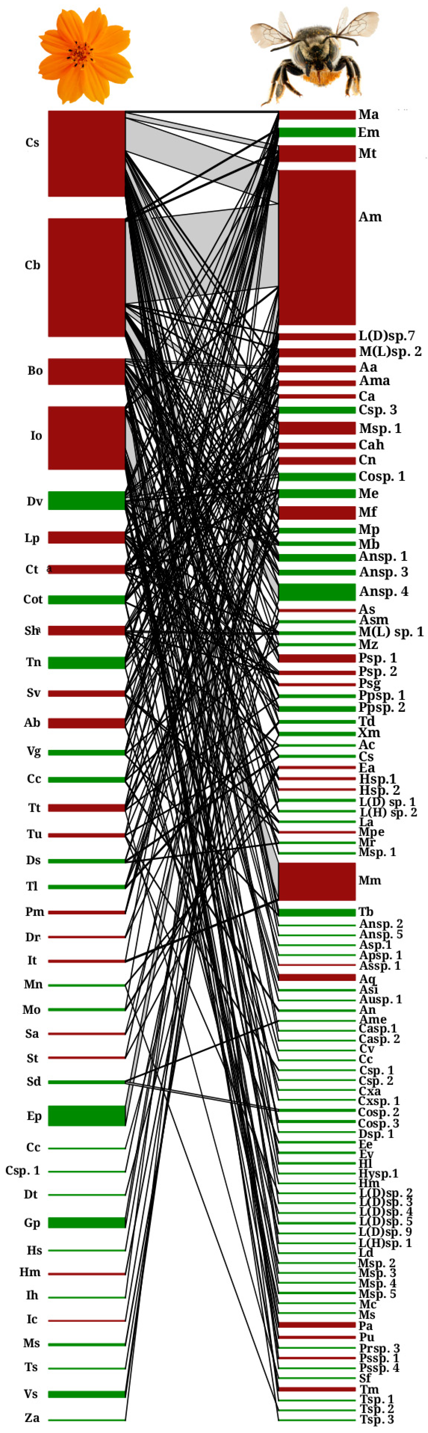 - Fontenla, J.L.; García, Y.F.; de Zayas, Á.Á.; Nápoles, N.R. Red de interacciones bipartitas de visitantes florales en Guanabo, Playas del Este, La Habana, Cuba. Poeyana 2023, 514, e514. [Google Scholar]