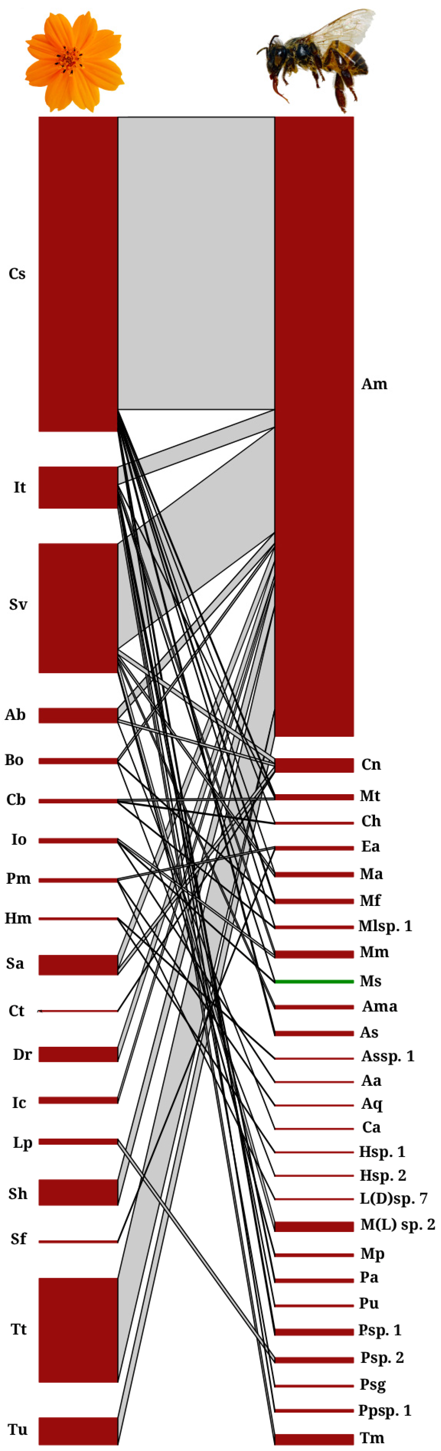 - Blüthgen, N.; Menzel, F.; Hovestadt, T.; Fiala, B.; Blüthgen, N. Specialization, constraints, and conflicting interests in mutualistic networks. Curr. Biol. 2007, 17, 341–346. [Google Scholar] [CrossRef] [PubMed]