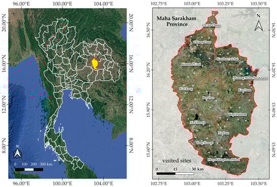 Maha Sarakham Province is situated at the heart of the Khorat Plateau in northeastern Thailand, encompassing approximately 5300 km2. Administratively, it is divided into 13 districts (Figure 1), located between 15°25′–16°40′ N and 102°50′–103°30′ E. The landscape is characterized by gently undulating plains ranging from 130 to 230 m above sea level. The province experiences a tropical monsoon climate, with a dry season from December to April and a rainy season from May to November. The Chi River flows through Maha Sarakham, playing a vital role in shaping local ecosystems and supporting the region’s biodiversity [14].