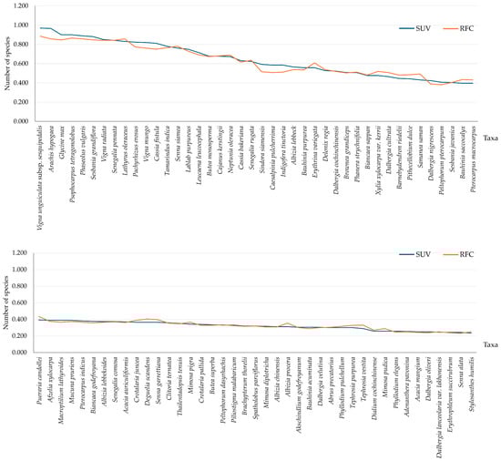 When comparing RFC and SUV across all 83 taxa, a consistent pattern emerged: species frequently mentioned by informants generally exhibited high use values, suggesting strong alignment between community recognition and practical utilization. For instance, Arachis hypogaea and Vigna unguiculata subsp. sesquipedalis demonstrated both high citation rates and intensive use, reflecting their multifunctional roles in food, fodder, and traditional medicine. Conversely, some species showed notable variation between RFC and SUV; for example, Cassia fistula (RFC = 0.750, SUV = 0.812) and Senna siamea (0.781, 0.762) had higher use values relative to citation frequency, suggesting specialized but valued uses within local ethnobotanical knowledge systems.