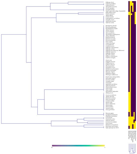 To further investigate patterns of diversity among Fabaceae species recorded in Maha Sarakham Province and to compare these findings with previous regional studies, the Unweighted Pair Group Method with Arithmetic Mean (UPGMA) [30] was applied exclusively to legume species. The matrix was constructed using presence/absence data (1 = species present, 0 = species absent) for each Fabaceae species across the surveyed locations. It was then analyzed using the UPGMA clustering method, and the resulting dendrograms and heatmap, generated in Past4 software (version 4.15), visualize species similarity across sites and highlight patterns of shared species among locations. This approach allowed for a direct comparison of species composition and diversity patterns between the current study area and previously documented sites in the province.