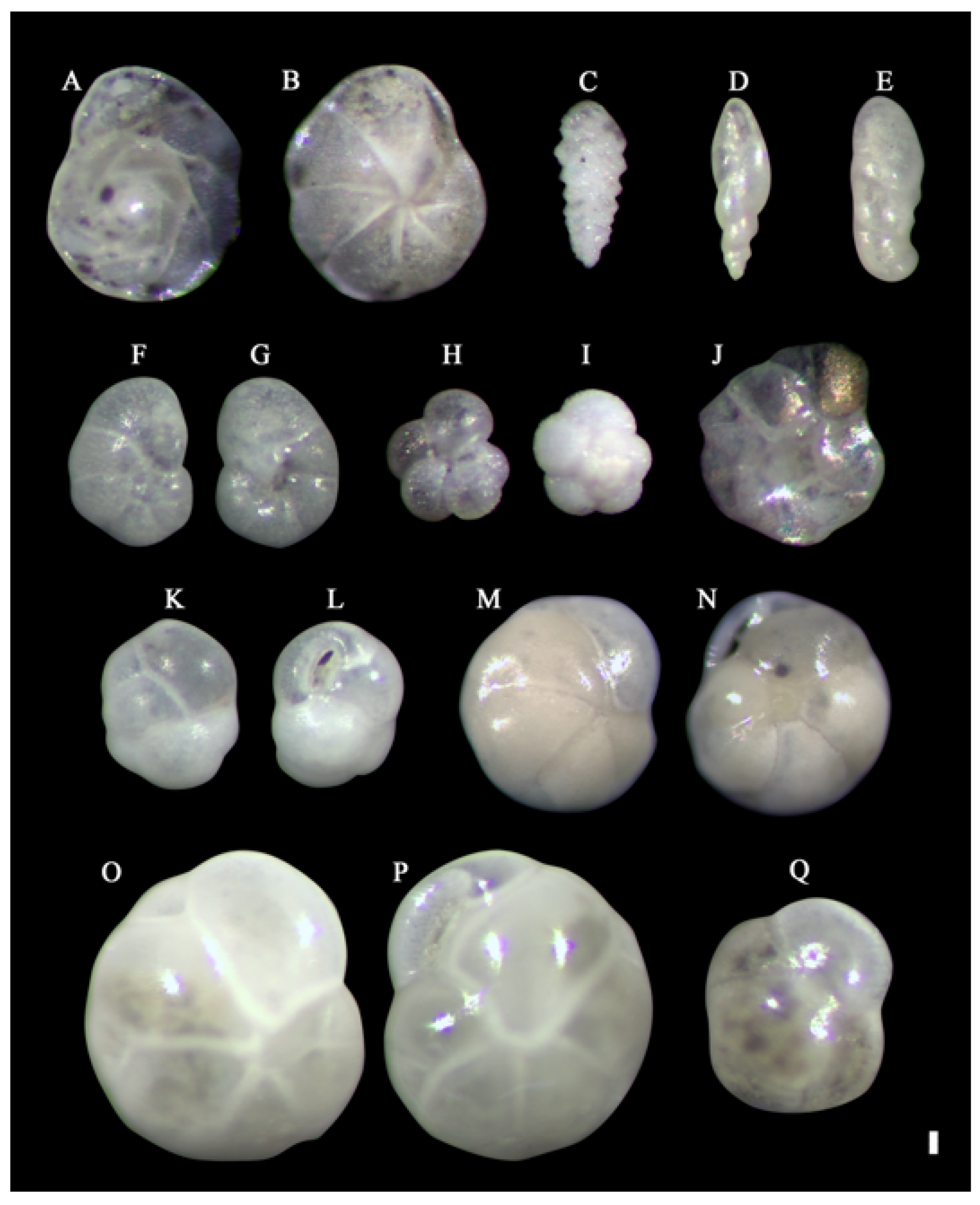 We identified 47 foraminiferal species spanning 32 genera and 20 families, comprising 15 planktic and 32 benthic taxa (higher-level classification follows Pawlowski et al., 2013). Seven species are newly recorded from Korean waters: the planktic Tenuitellita fleisheri and Neogloboquadrina atlantica subsp. praeatlantica, and the benthic Islandiella algida, Uvigerina asperula, Pseudonodosaria aequalis, Pseudonodosaria obtusissima, and Astacolus crepidula. Among planktic taxa, Neogloboquadrina pachyderma—a species commonly associated with polar waters and upwelling regimes—was observed, and all five intraspecific morphotypes were recorded. Among benthic foraminifera, Islandiella norcrossi was the most abundant taxon in our material.