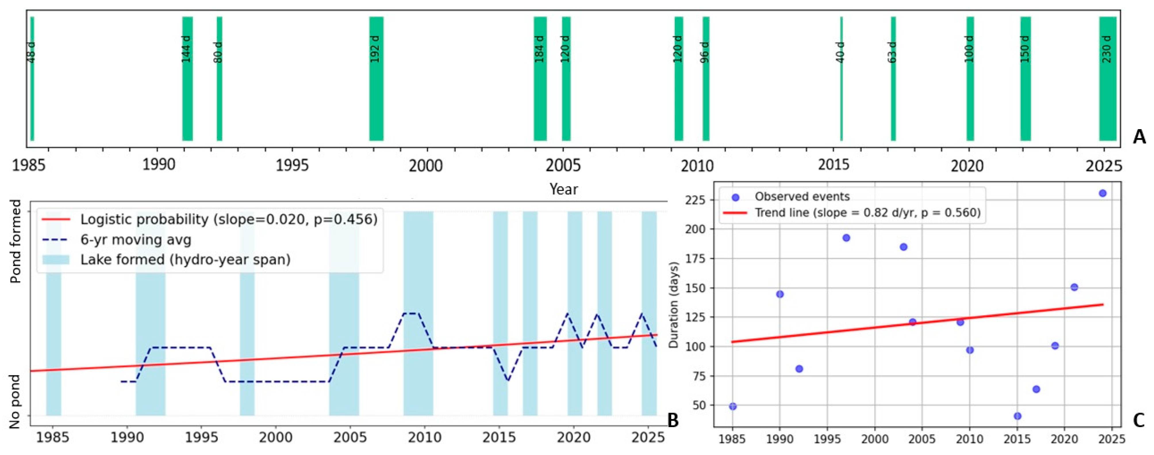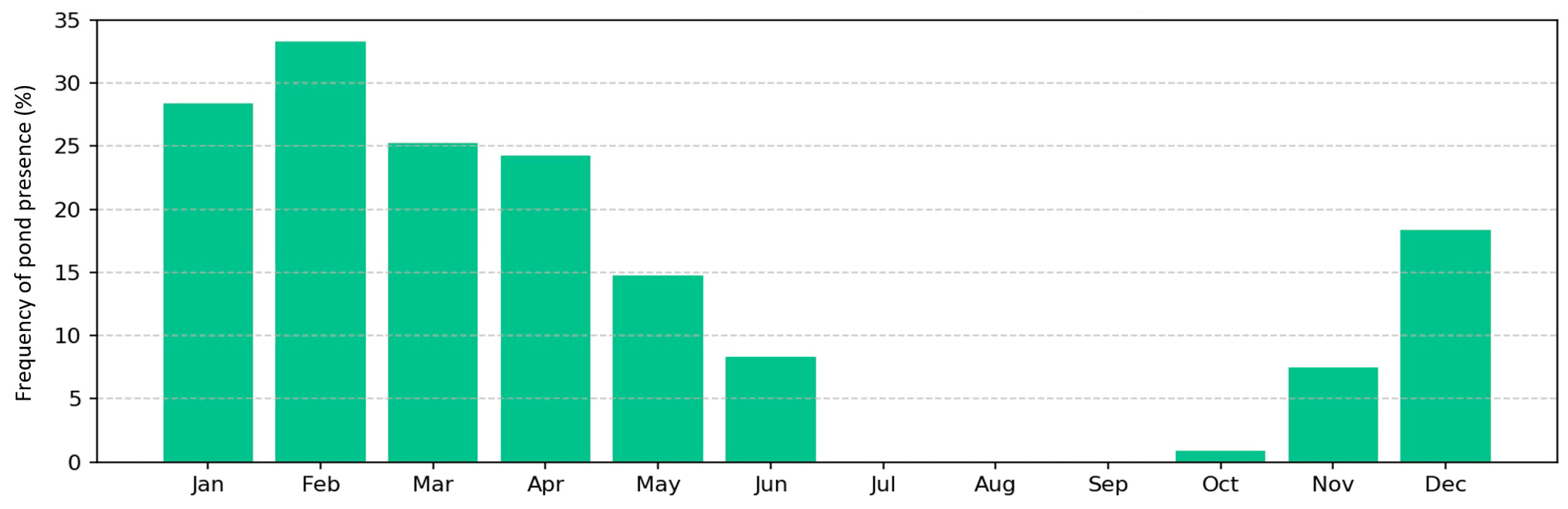 3.1. Frequency, Duration, and Seasonal Distribution of Pond Formation Events (1984–2025)