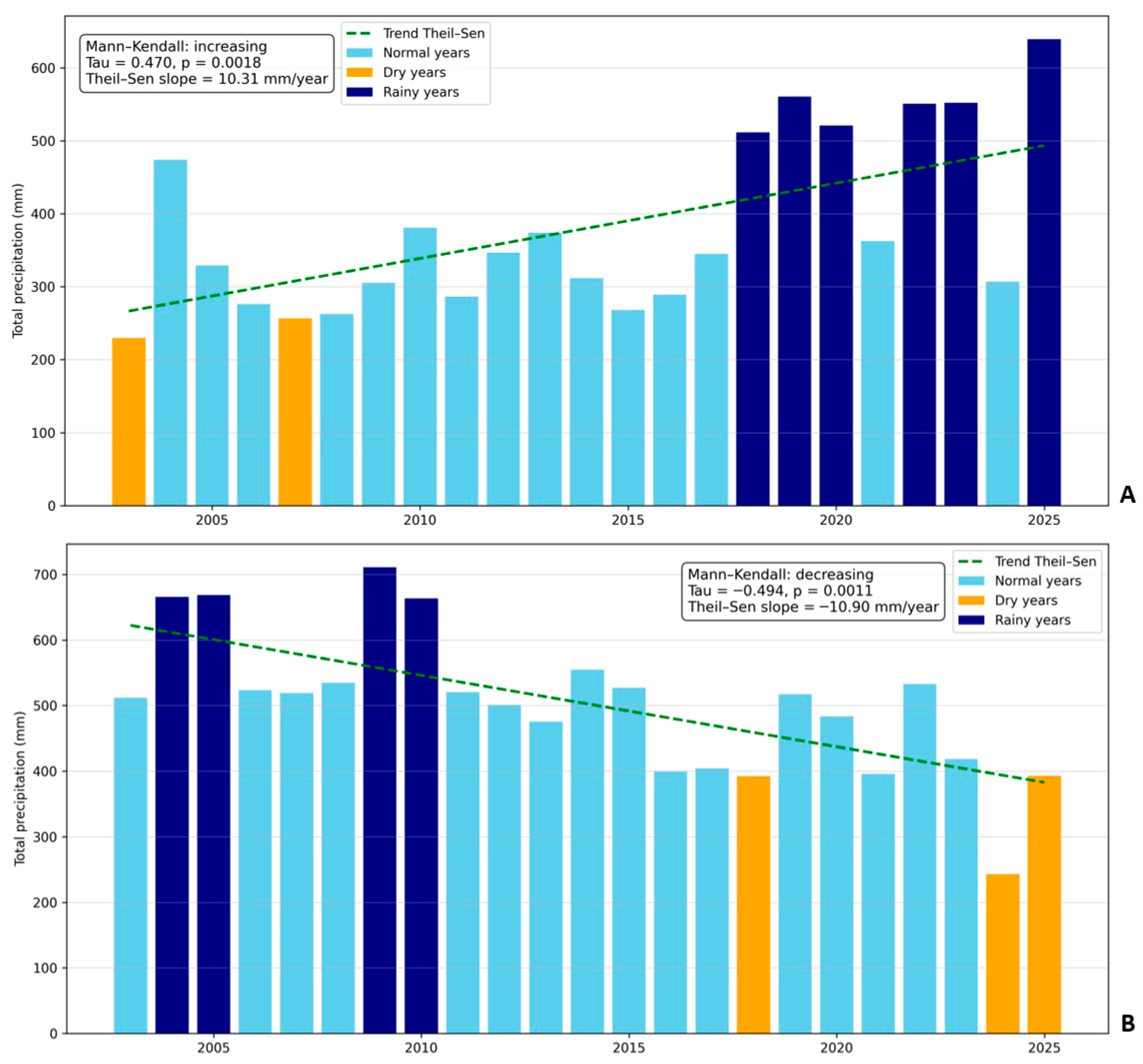 3.2. Analysis of Precipitation Trends (2002–2025)