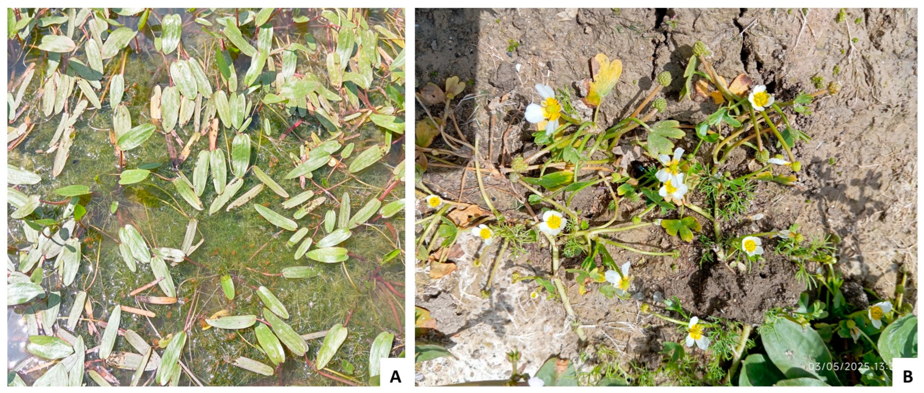 - Rich, T.C.G.; Nicholls-Vuille, F.L. Taxonomy and distribution of European Damasonium (Alismataceae). Edinb. J. Bot. 2001, 58, 45–55. [Google Scholar] [CrossRef]