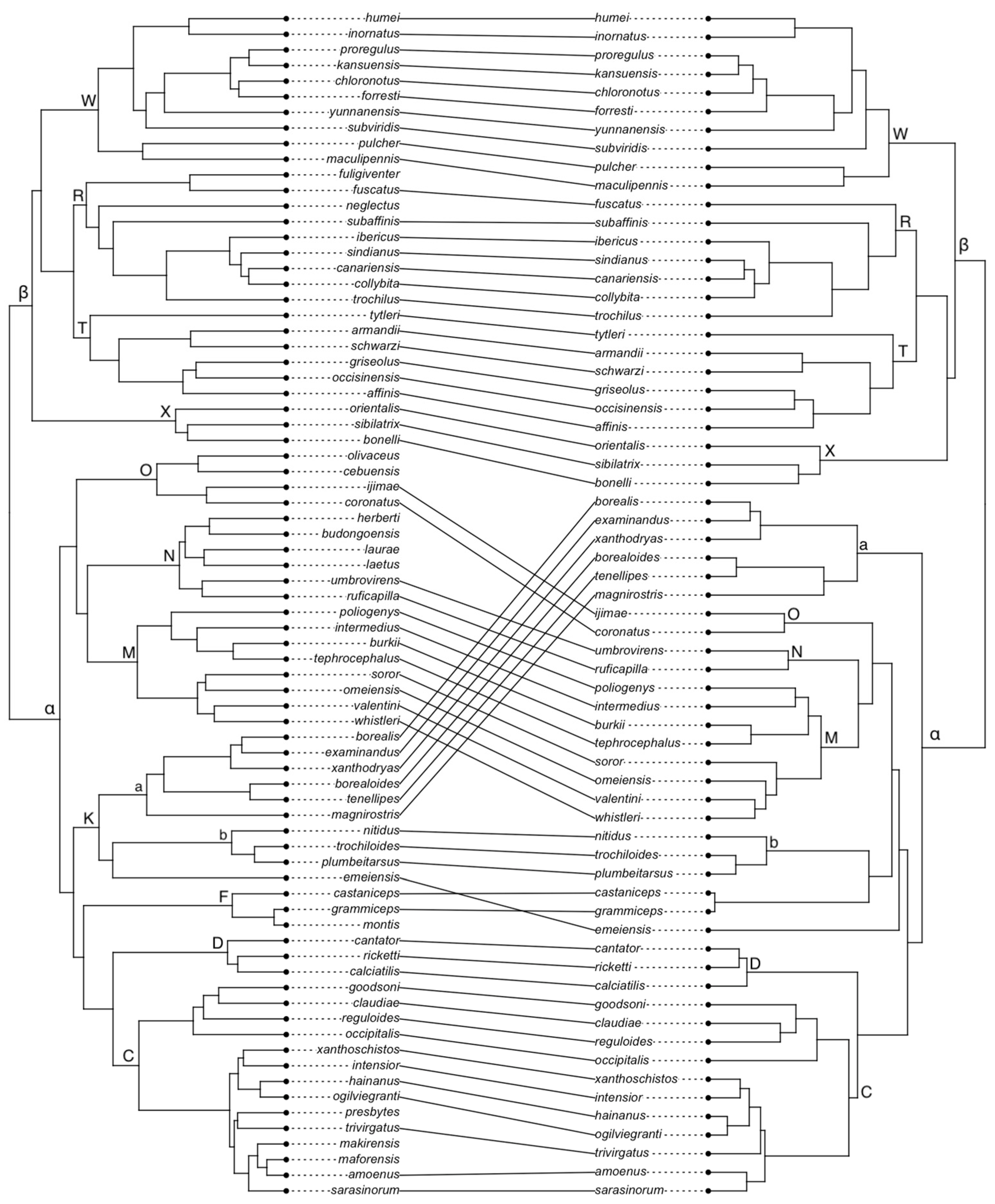- Alström, P.; Rheindt, F.E.; Zhang, R.; Zhao, M.; Wang, J.; Zhu, X.; Gwee, C.Y.; Hao, Y.; Ohlson, J.; Jia, C.; et al. Complete species-level phylogeny of the leaf-warbler (Aves: Phylloscopidae) radiation. Mol. Phylogenet. Evol. 2018, 126, 141–152. [Google Scholar] [CrossRef] [PubMed]