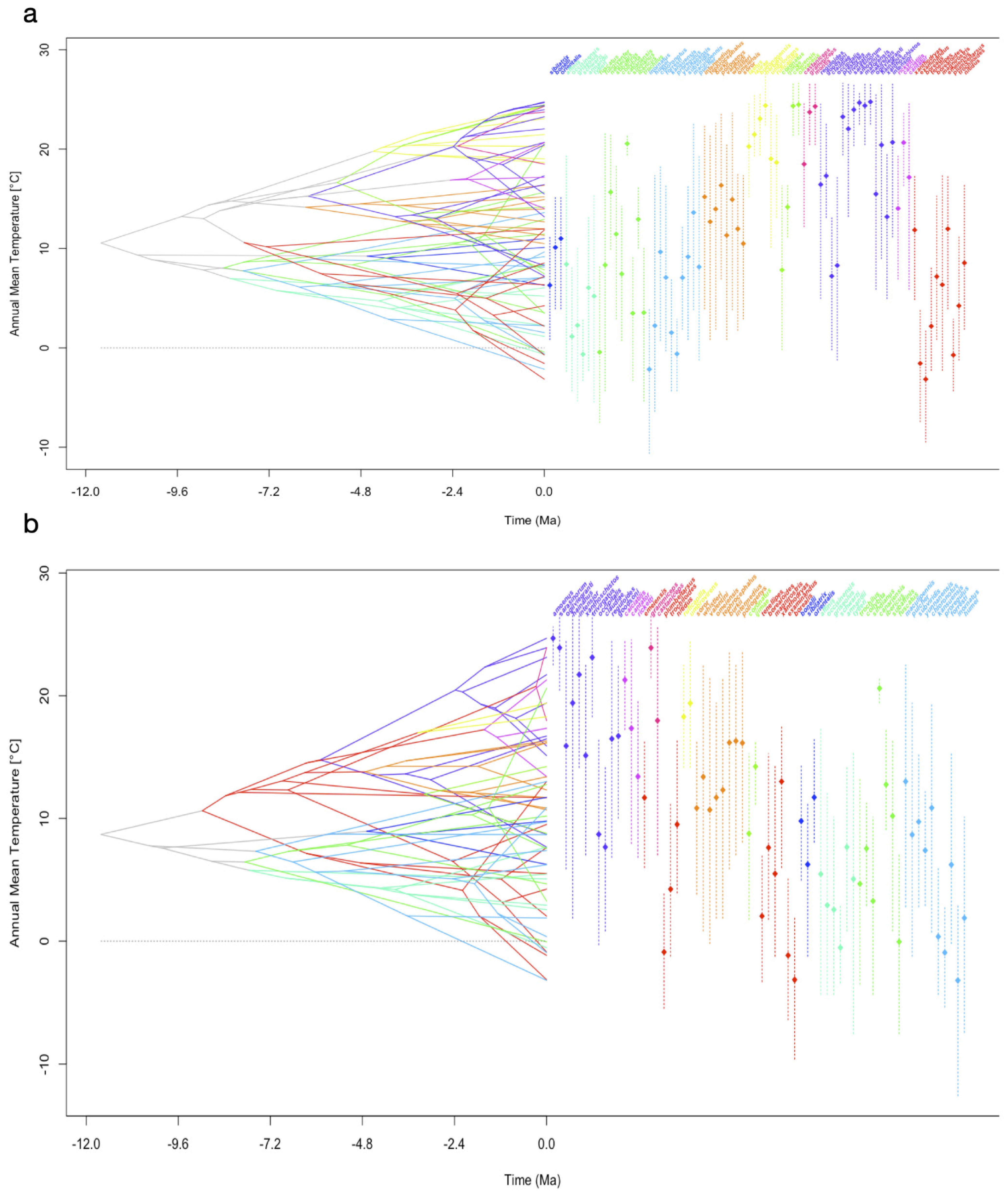 - Boucher, F.C.; Thuiller, W.; Davies, T.J.; Lavergne, S. Neutral biogeography and the evolution of climatic niches. Am. Nat. 2014, 183, 573–584. [Google Scholar] [CrossRef]