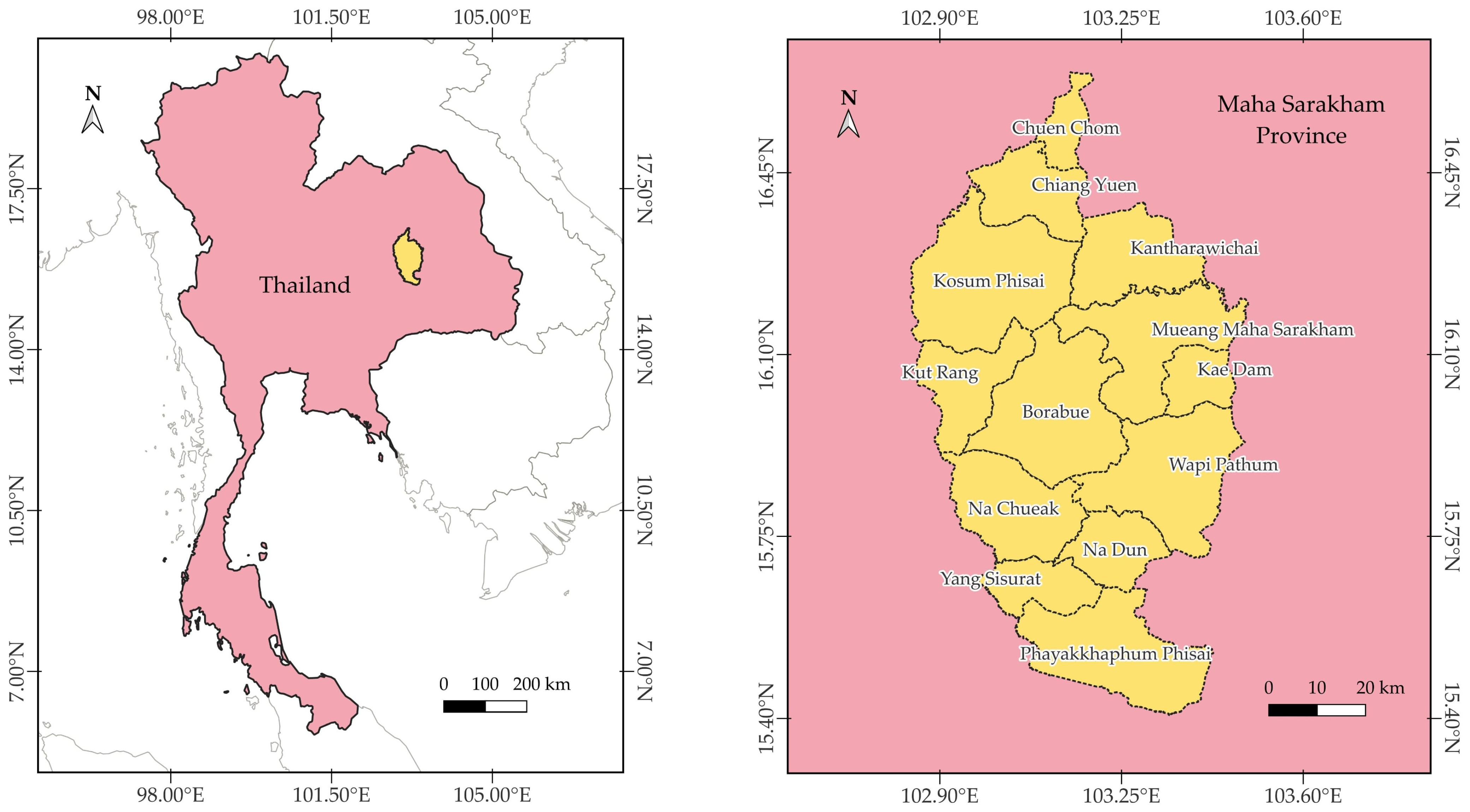 - WorldMaps. Map of Maha Sarakham Province, Thailand. Available online: https://www.worldmaps.info/Thailand/maha-sarakham/ (accessed on 12 November 2025).