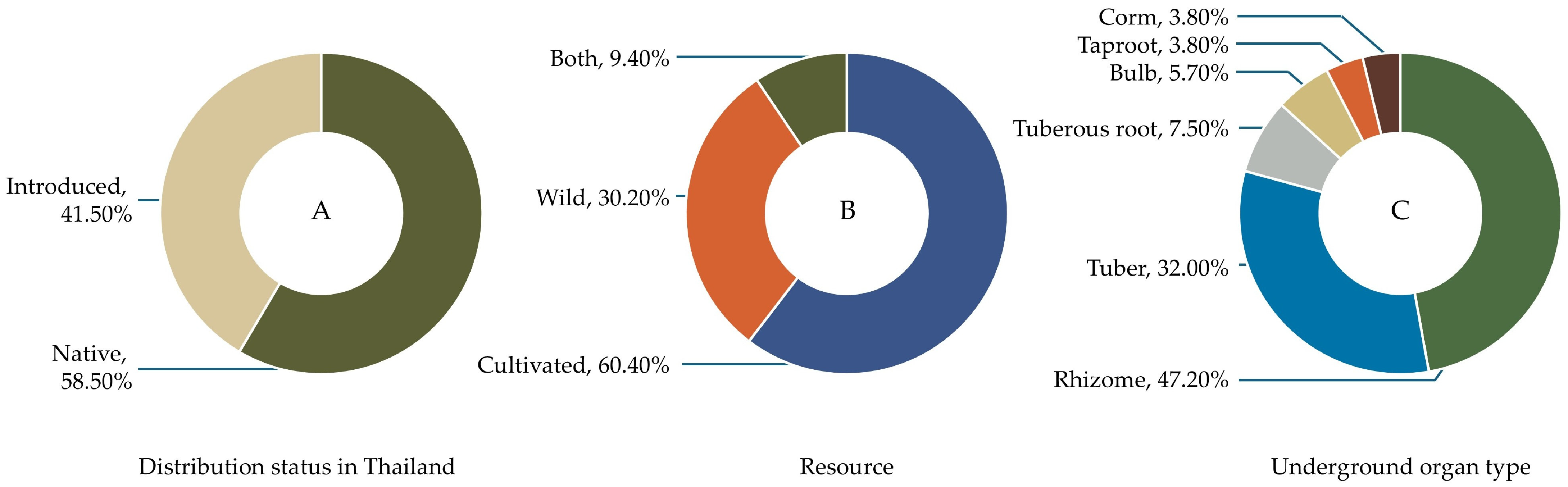 Saensouk, P.; Saensouk, S.; Ragsasilp, A.; Appamaraka, S.; Junsongduang, A.; Sonthongphithak, P.; Zhang, Y.; Jitpromma, T. Exploring Edible Underground Storage Organ Plants in Maha Sarakham Province, Thailand: Diversity, Traditional Uses, and Horticultural Importance. Diversity 2025, 17, 846. https://doi.org/10.3390/d17120846