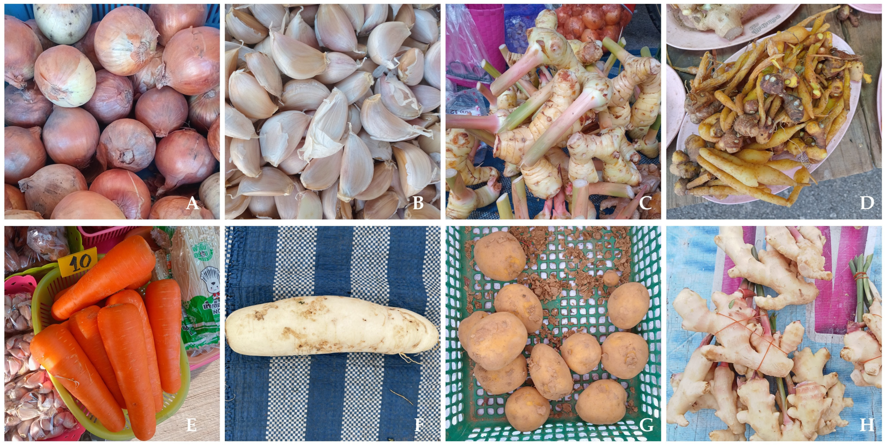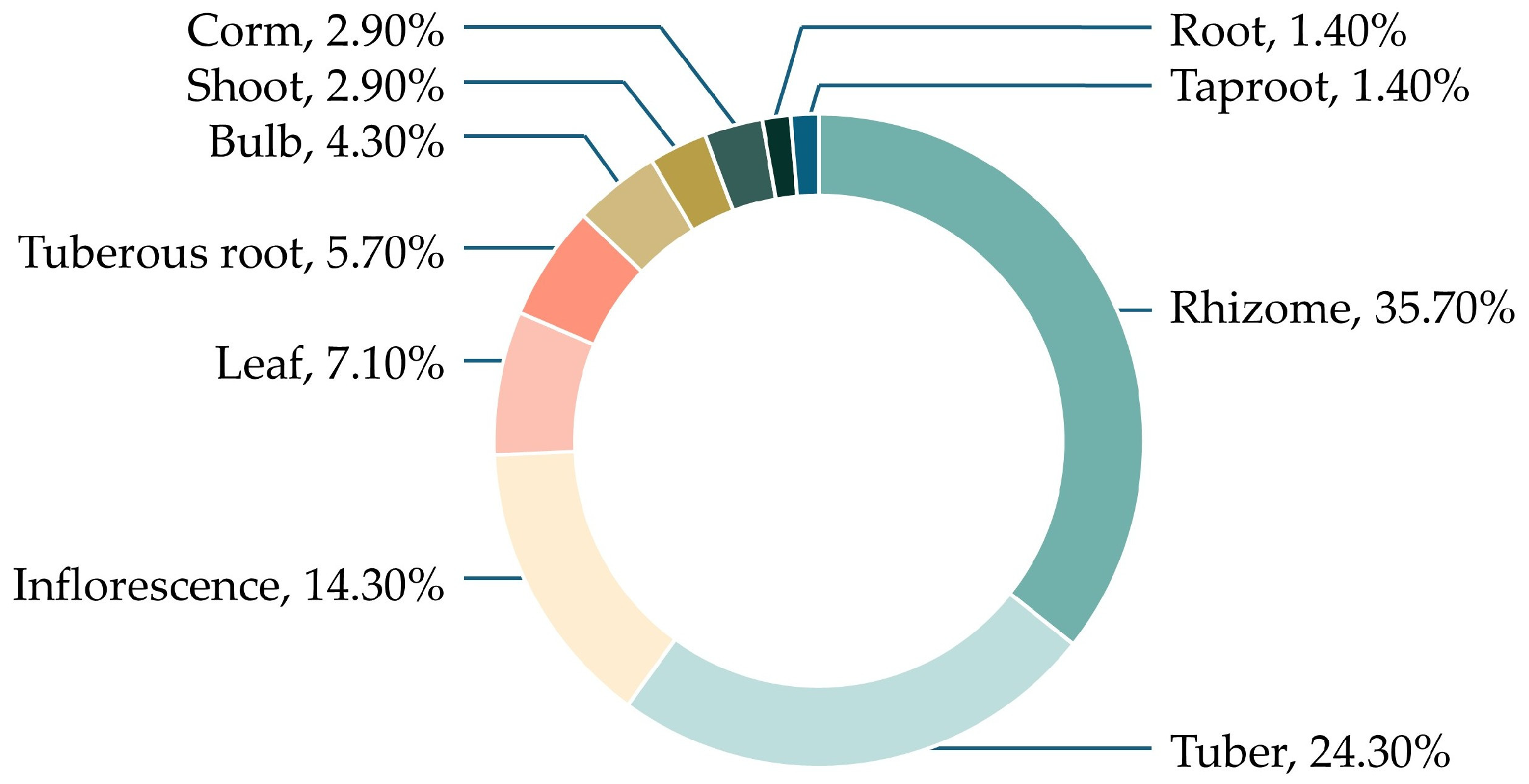 - Karle, B.; Rote, K.; Kumari, P.; Gagotia, R.; Choudhari, S.; Manjula, B.L.; Kumar, S. Common Wild Ethnomedicinal Tuberous Plants of Asia. Ecol. Environ. Conserv. 2022, 28, 9. [Google Scholar] [CrossRef]