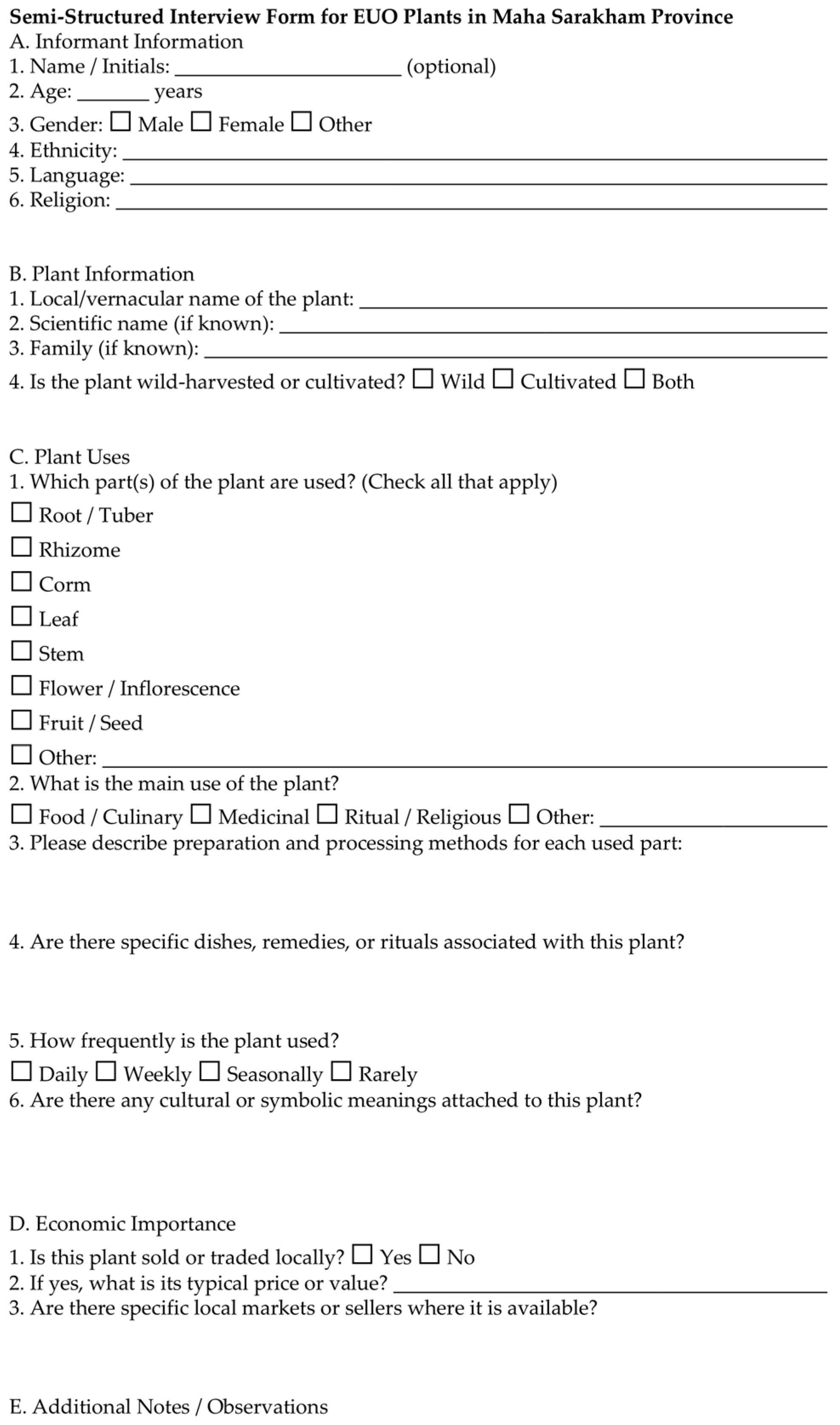 - Junsongduang, A.; Saensouk, S.; Balslev, H. Amnat Charoen Healers in Thailand and Their Medicinal Plants. Plants 2025, 14, 602. [Google Scholar] [CrossRef] [PubMed]