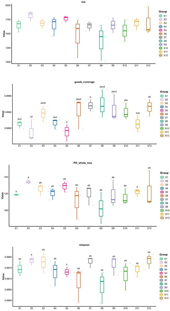 Alpha diversity indices of microbial communities in sediments from different sampling points. Note: Two sets sharing one or more letters indicate no ‘significant’ difference.