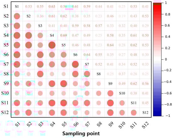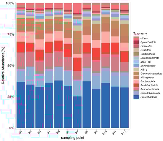 The alpha diversity indices of microbial communities in sediments from various sampling locations were calculated and illustrated in a plot of microbial community alpha diversity indices (Figure 2). Good’s Coverage Index indicates that each sample possesses an index exceeding 0.999, suggesting that the sequencing depth has effectively encompassed all species present in the samples. The ace diagram reveals that S2 exhibits the highest species count, whereas S8 displays the lowest. Figure 3 illustrates that the Shannon index provides a comprehensive assessment of both species richness and evenness. The sampling point exhibiting the highest Shannon index is S2 (9.83), while the point with the lowest index is S11 (9.33). The Simpson index, which quantifies community dominance, reveals that the maximum value is found at sampling point S3 (0.9978), whereas the minimum value is recorded at S11 (0.9967). The Chao1 and ACE indices serve primarily to estimate the total species count within a community; a higher Chao1 index indicates a greater total number of species. The maximum value is observed at sampling point S2 (1837.61), in contrast to the minimum value at S8 (1702.60). Notably, the differences among these points are not statistically significant.