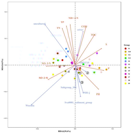 Redundancy analysis of microbial genera in intertidal zone sediment samples with sediment and seawater physicochemical indicators. The orange arrows represent environmental factors, and the blue arrows represent bacterial strains. Dots of different colors represent different stations, and dots of the same color represent three parallel dots at the same station. ① represents cm1-21, ② represents BD2-11_terrestrial_group, and ③ represents Subgroup_22.