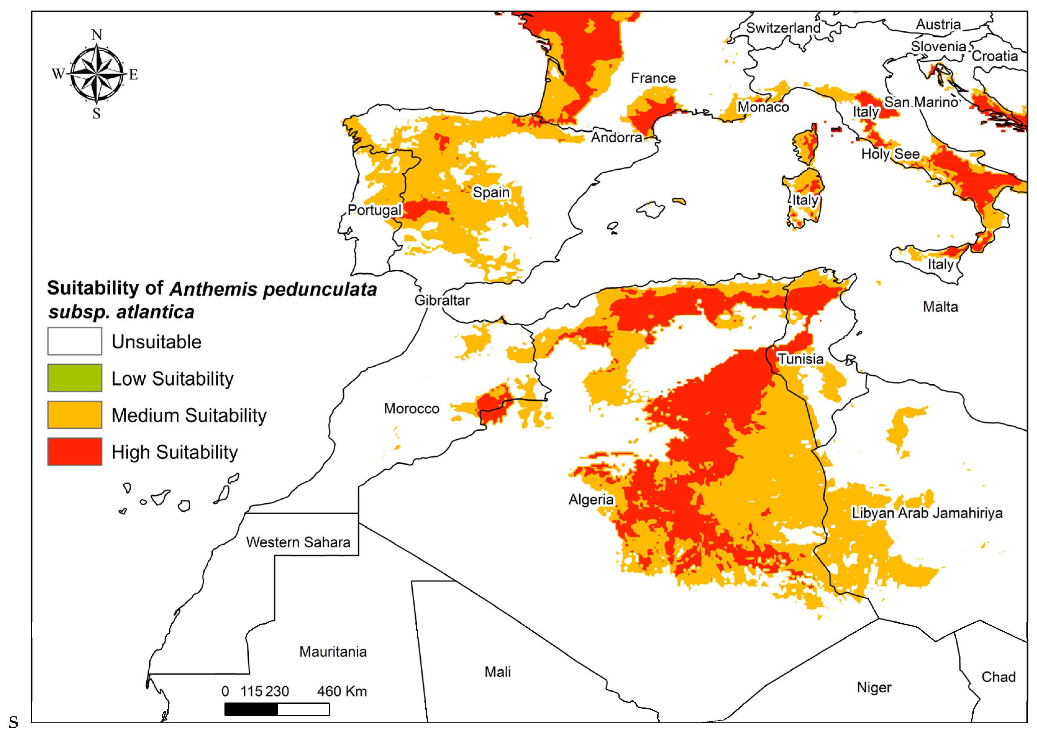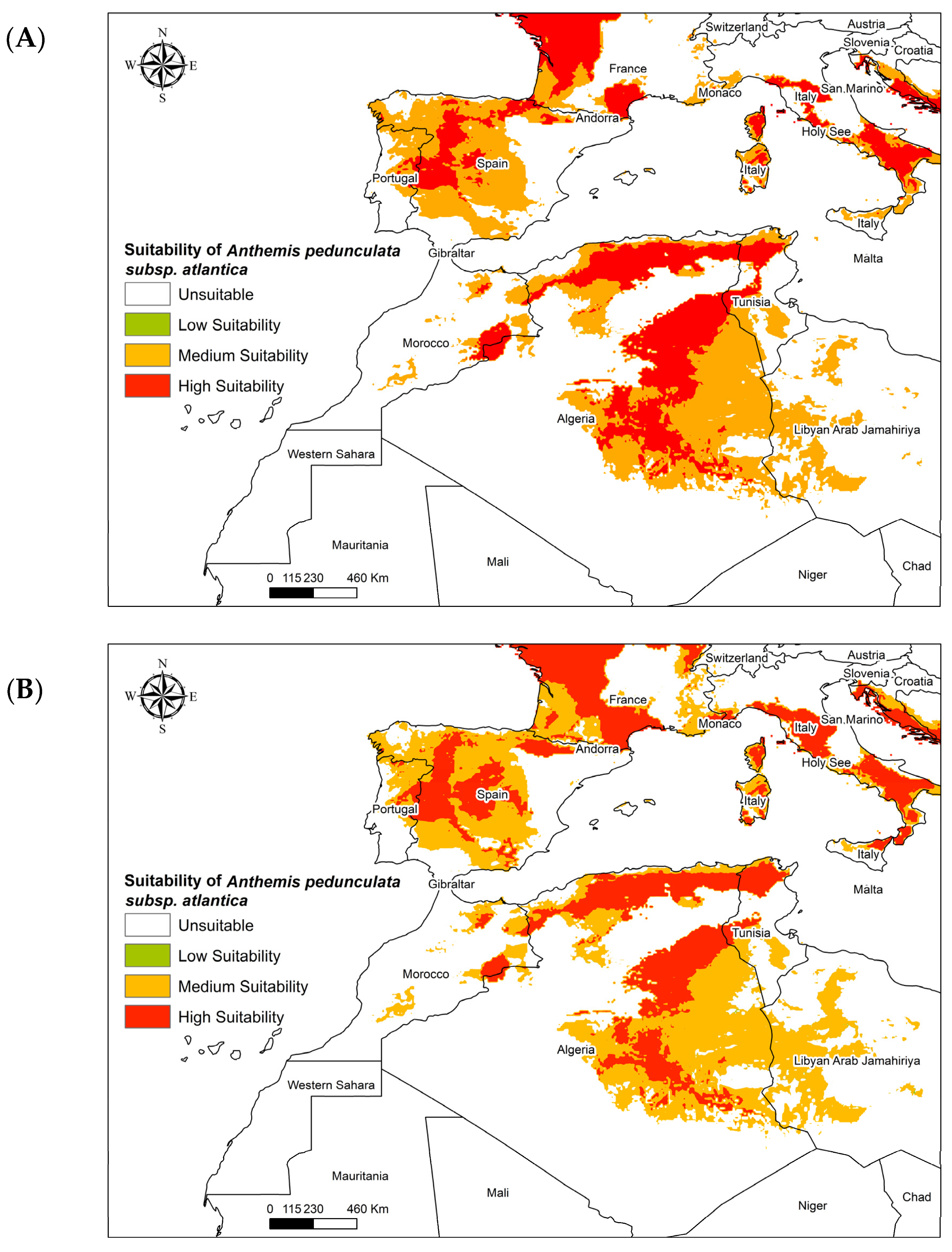 Mechergui, K.; Jaouadi, W.; Azevedo, C.H.S.; Faqeih, K.Y.; Alamri, S.M.; Alamery, E.R.; Aldubehi, M.A.; Souza, P.G.C. Modeling Habitat Suitability for Endemic Anthemis pedunculata subsp. pedunculata and Anthemis pedunculata subsp. atlantica in Mediterranean Region Using MaxEnt and GIS-Based Analysis. Diversity 2025, 17, 851. https://doi.org/10.3390/d17120851