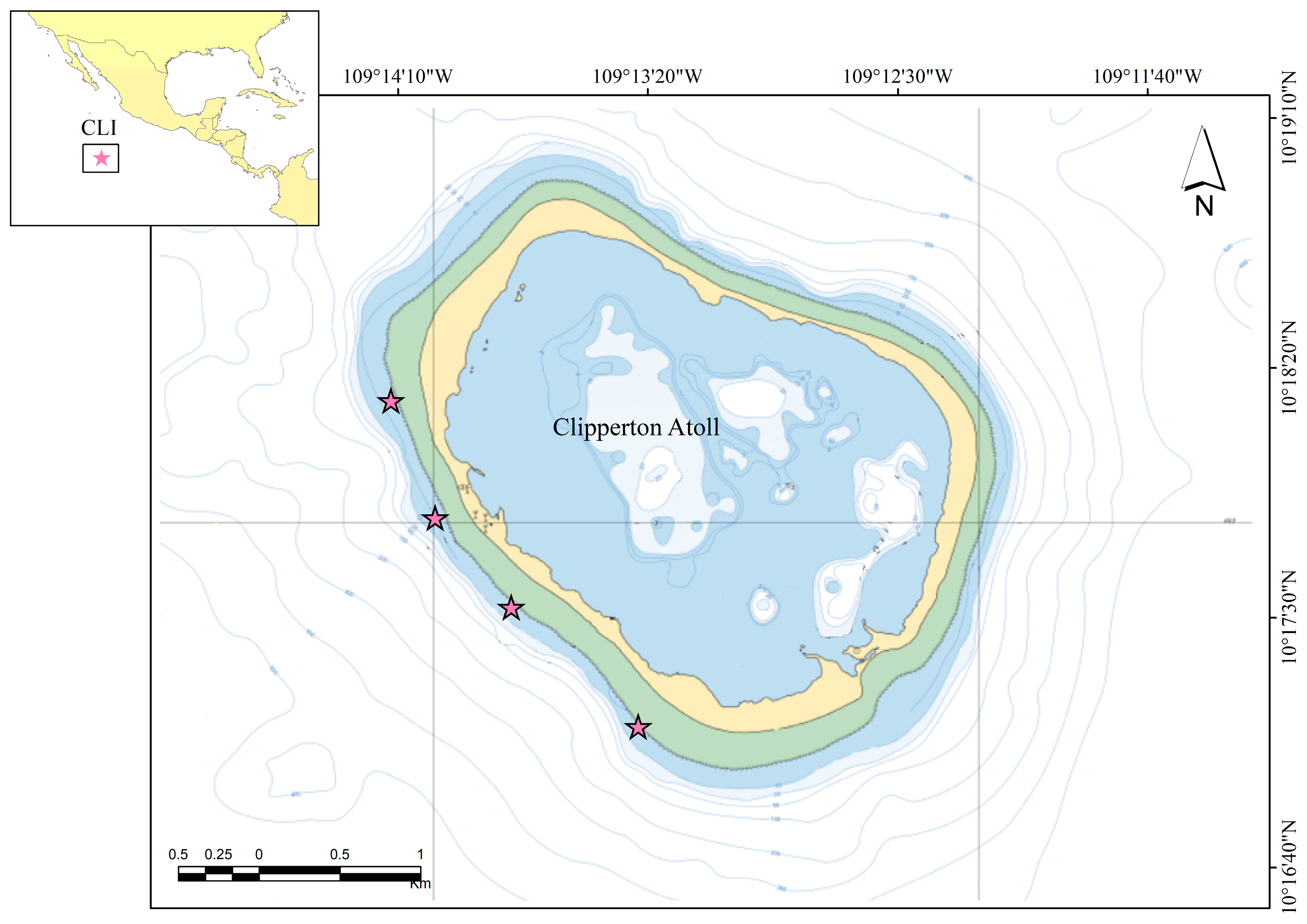 - Glynn, P.W.; Veron, J.E.N.; Wellington, G.M. Clipperton Atoll (eastern Pacific): Oceanography, geomorphology, reef-building coral ecology and biogeography. Coral Reefs 1996, 15, 71–99. [Google Scholar] [CrossRef]