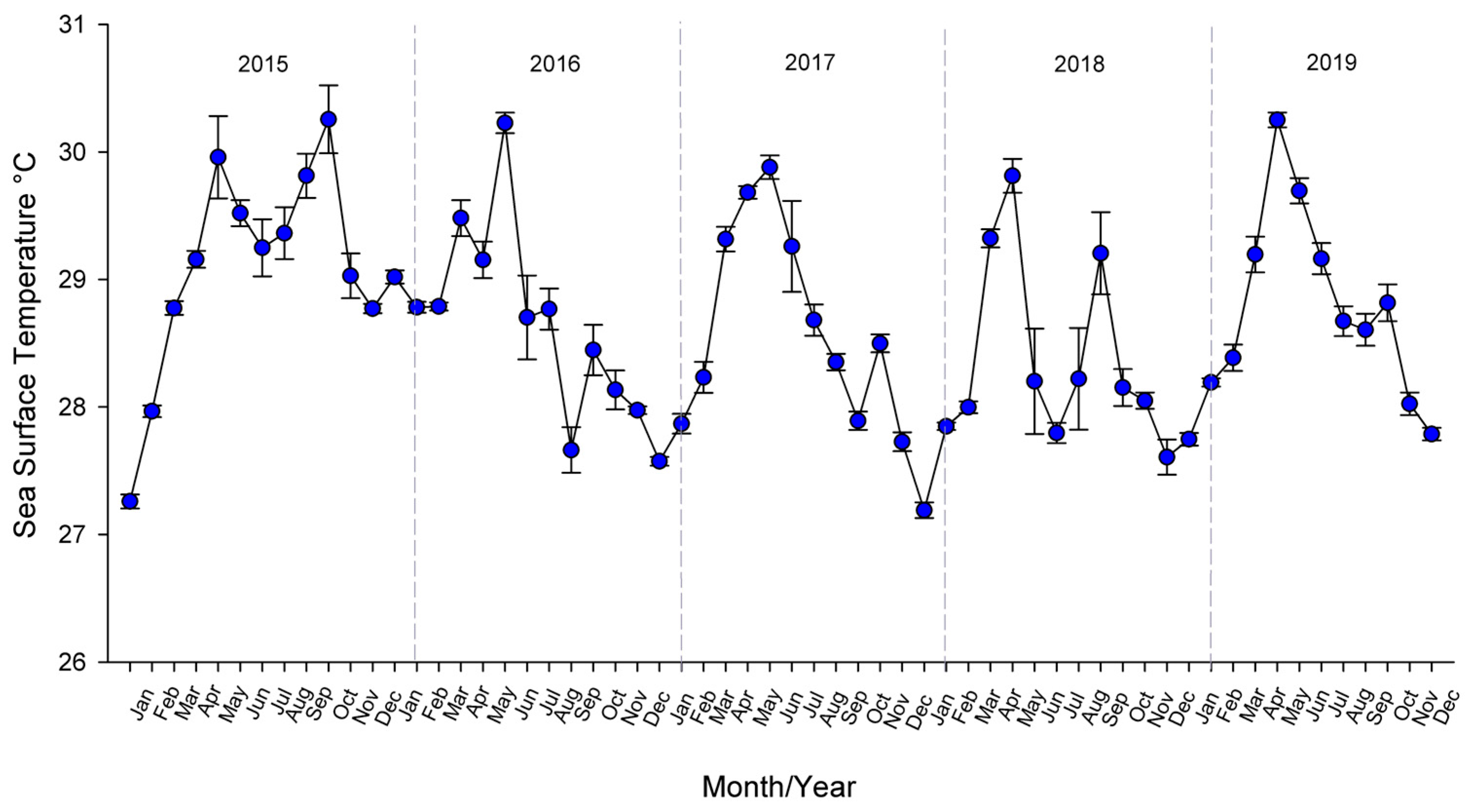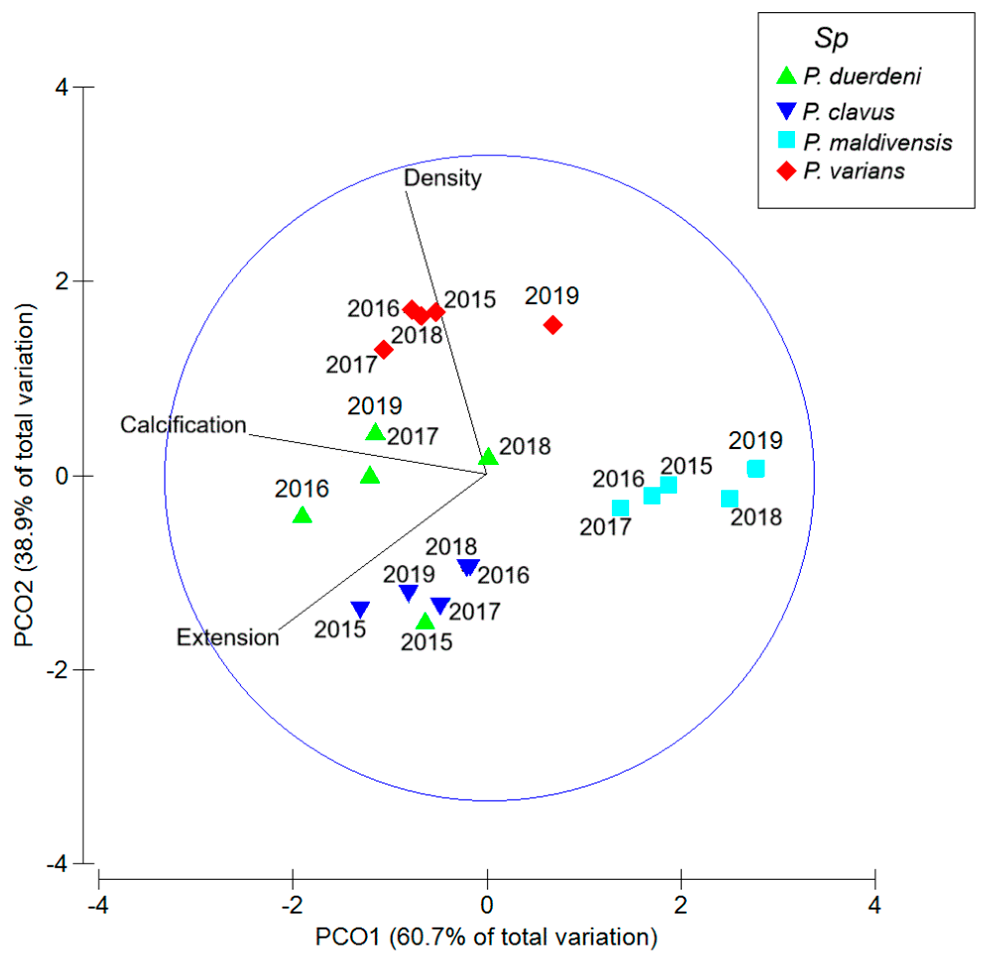 | P. maldivensis | 2019 | 1.21 ± 0.11 | 0.59 ± 0.03 | 0.71 ± 0.06 |