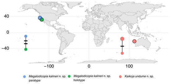 The Megalodicopia kalineri n. sp. holotype and one paratype, from San Clemente Escarpment, USA, and Monterey, USA, respectively, showed haplotypes differentiated by two base pairs over a short segment of COI (Figure 2), representing a pairwise distance of just over 1%. The Kaikoja undume n. sp. holotype and two paratypes, both from Cape Range Canyon, Australia, showed haplotypes differentiated by a single base pair (Figure 2). The haplotype network is positioned over a world map with the sampled localities of specimens indicated by colored circles.
