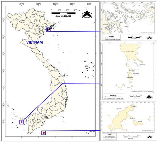 Sampling was conducted in Ha Long and Bai Tu Long bays and Phu Quoc and Con Dao islands in Vietnam (Figure 1). Ha Long and Bai Tu Long bays are situated in northeastern Vietnam and are classic karst seascapes characterized by submerged limestone, with numberless impressive cones and tower-like islets, and extensive coastal erosion features. Phu Quoc (southwestern Vietnam) and Con Dao (southern Vietnam) are large archipelagos comprising 18 and 16 islands, respectively.