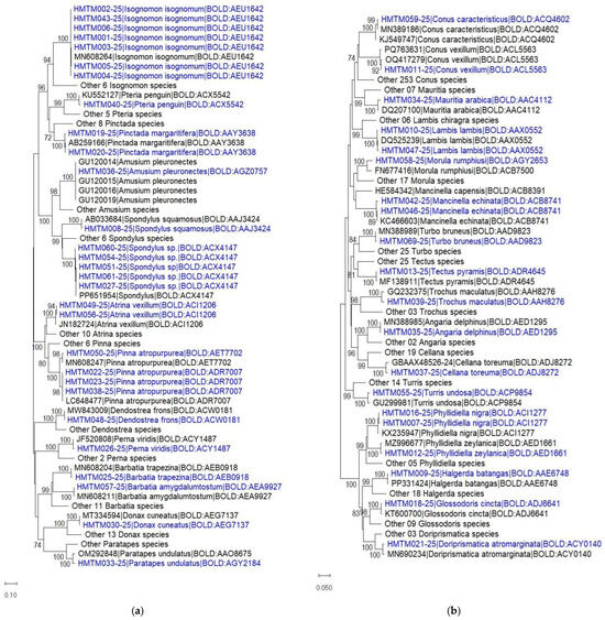 BLAST searches in GenBank and BOLD provided the same results and categorized 44/49 samples into 30 putative species, of which 27 species met the threshold value of 97–100% sequence similarity. Three samples were identified as Pinna atropurpurea G. B. Sowerby I, 1825, Morula rumphiusi Houart, 1996, and Paratapes undulatus (Born, 1778), with lower similarity values (94–100%) (Table 1). The five remaining samples (TM02DHD-79, TM122-39(L), TM115-145, TM9TT-4, and TM35-75) did not yield a species name after the BLAST search (https://blast.ncbi.nlm.nih.gov/Blast.cgi; accessed on 18 August 2025) due to the lack of available sequences in the NCBI and BOLD databases. Those five samples were labeled as Spondylus sp. and were identified to species levels as Spondylus nicobaricus Schreibers, 1793; Spondylus echinatus A. d’Orbigny 1853; and Spondylus squamosus Schreibers, 1793 by morphological analysis.