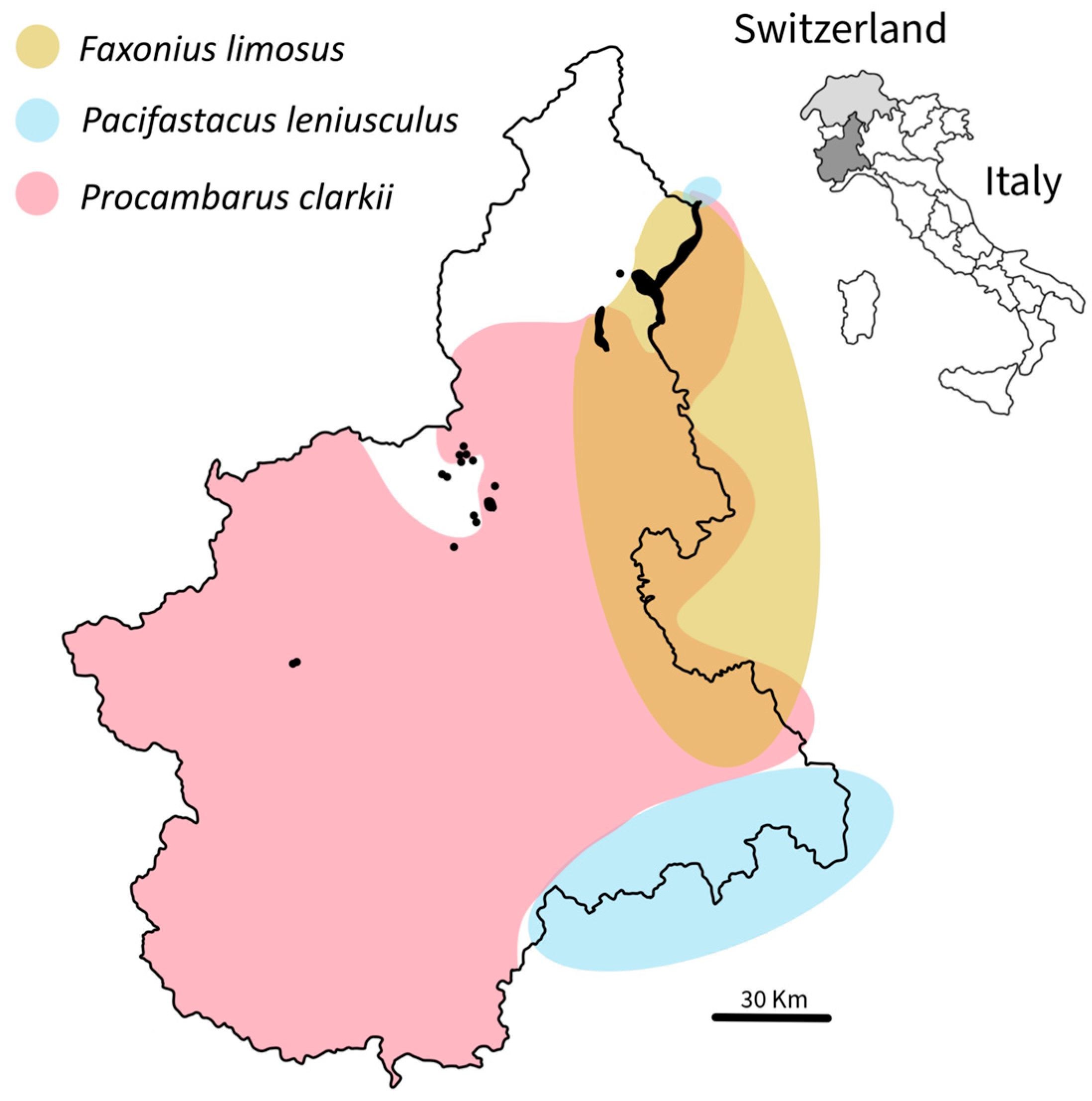 - Maganza, A.; Gabetti, A.; Mossotto, C.; Pastorino, P.; Esposito, G.; Di Nicola, M.R.; Rizzioli, B.; Elia, A.C.; Prearo, M. Assessing the distribution and habitat suitability of Austropotamobius pallipes complex in proximity of invasive Procambarus clarkii in the Avigliana Lakes (northwest Italy): An integrated approach to ecosystem health and conservation. Aquat. Sci. 2025, 87, 50. [Google Scholar] [CrossRef]