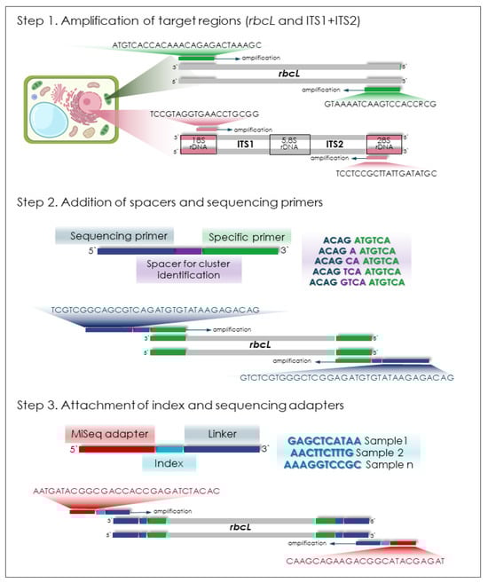 Library preparation for Illumina MiSeq sequencing (AmpliSeq technology) involved three PCR steps: (1) initial amplification of target regions using universal primers for rbcL and ITS1 + ITS2; 2); (2) addition of spacers and sequencing primers; (3) attachment of indexes and sequencing adapters (Figure 2) [66]. The ITS1 and ITS2 regions were amplified in a single PCR reaction using ITS1/ITS4 primers (product is ITS1-5.8S rDNA-ITS2) (Table 1). All PCR reactions used Tersus Plus polymerase (Eurogen, Moscow, Russia) in 25 µL reactions containing: 0.5 µL polymerase; 5 µL 5X Tersus Red buffer; 0.5 µL 50X dNTPs (10 mM each); 2 µL each of primer (10 pM/µL); 1 µL DNA template (50 ng/µL); and 14 µL water.