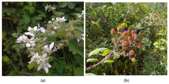 Morphology of a specimen 33 identified as Rubus corchorifolius L.fil by rbcL barcode: (a) flowering shoots and (b) ripening fruits.