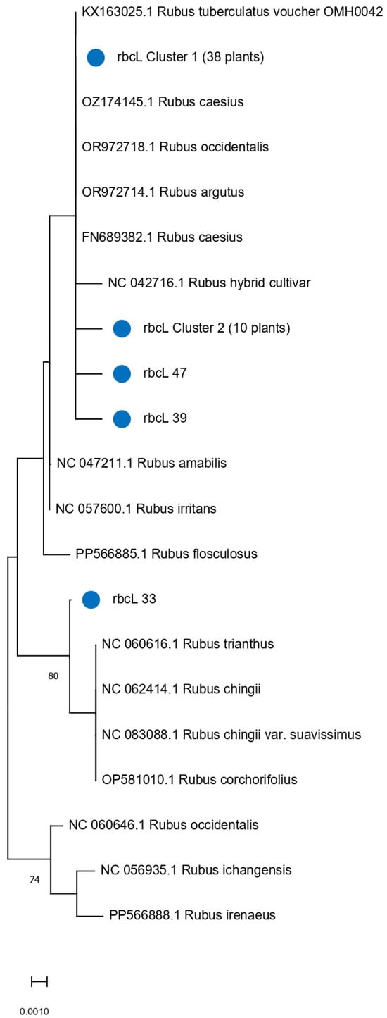 Phylogenetic tree showing relationships among 51 Rubus accessions based on rbcL barcode sequences. The tree was inferred using the Maximum Likelihood method with the Jukes–Cantor substitution model. Branch support was evaluated with 500 bootstrap replicates; values below 70% are hidden. Blue circles highlight clusters that group accessions with identical rbcL barcode sequences.