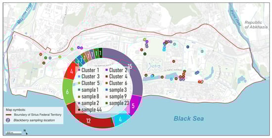 Analysis of the internal transcribed spacer regions (ITS1 and ITS2) revealed a more complex genetic structure compared to the rbcL barcode. The sequences were grouped into six multi-sample clusters and eight singleton clusters based on nucleotide similarity. The largest cluster 1 contained 15 samples, which were genetically closest to Rubus sanctus Schreb. (Figure 8). Cluster 4 was also substantial, comprising 12 samples. Cluster 5 included six samples (21, 28, 34, 116, 118, 119), while cluster 6 contained four samples (4, 7, 24, 118-1). The remaining multi-sample clusters, Cluster 2 and Cluster 3, consisted of five and four samples, respectively. Additionally, eight samples (1, 3, 8, 9, 22, 23, 44) formed unique singleton clusters, each representing a distinct haplotype (Figure 8). As shown in Figure 8, the spatial distribution of clusters appears to correlate with the degree of landscape modification. Clusters 1, 2, and 3 are mainly found in areas that experienced minimal soil disturbance during the construction of Olympic facilities and are located along the same drainage channel, suggesting preservation of the original genetic structure. In contrast, Cluster 4 tends to occur in zones that underwent more intensive anthropogenic transformation. The increased resolution and higher number of clusters observed with the ITS markers highlight their greater variability and utility for distinguishing closely related Rubus taxa compared to the chloroplast rbcL gene (Figure 9).