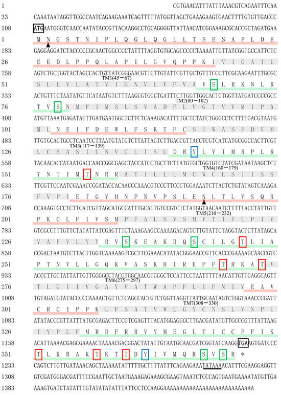Nucleotide and deduced amino acid sequences of Sj5-HT6r. The initiation codon (ATG) and stop codon (TGA) are indicated with black boxes. The predicted transmembrane regions are indicated in gray shading; the predicted extracellular region is indicated in bold pink underline; the predicted intracellular region is indicated in bold green underline; the predicted glycosylation sites are indicated by ▲; the blue boxes mark the predicted phosphorylation sites for tyrosine (Y), the red for threonine (T), and the green for serine (S). The numbers on the left represent nucleotide and amino acid numbers, respectively. The polyadenylation signal sequence (TATAA) is marked with a black underline.