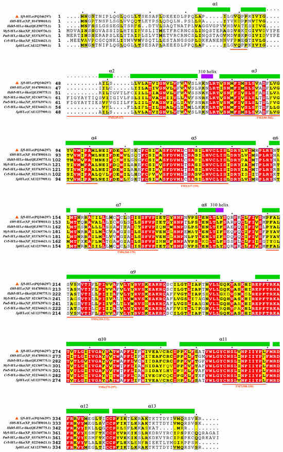 The 5-HT6 receptors amino acid sequences from six mollusks were selected for multi-sequence alignment with Sj5-HT6r. ESPript sequence alignment results showed that Sj5-HT6r has high sequence similarity with the 5-HT6r of other invertebrates, especially cephalopods. The results showed that the sequence identity between Sj5-HT6r and 5-HT6r of Sepia pharaonis (SpHT6r) was 98.92%. Additionally, Sj5-HT6r shared 75.64% identity with 5-HT6r of Octopus bimaculoides (Ob5-HT6r), 66.06% with 5-HT6r of H. discus hannai (Hdh5-HT6r-like), 65.83% with 5-HT6r-like of Mizuhopecten yessoensis (My5-HT6r-like), 62.51% with 5-HT6r-like of Pecten maximus (Pm5-HT6r-like), and 52.77% with 5-HT6r-like of Crassostrea virginica (Cv5-HT6r-like). The predicted secondary structure referenced the SpHT6r structure (A0A812BQG1.1. A), including 13 alpha helices and two 310 helices (Figure 2).