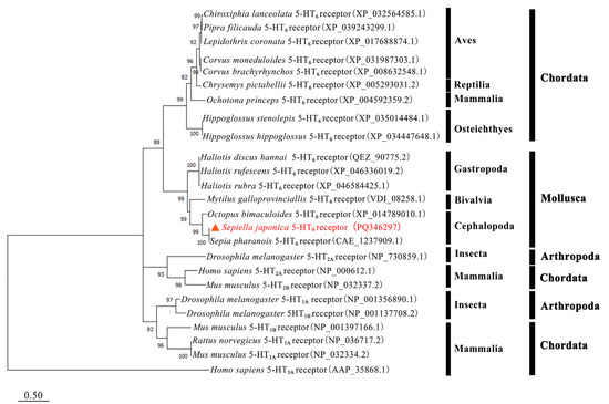 The phylogenetic tree of Sj5-HT6r and 24 other 5-HT receptor sequences from 21 species was built using the maximum likelihood method (Figure 3). The results showed that Sj5-HT6r initially diverges into two major branches with other 5-HT receptors of the phylum Chordata and Arthropoda. Subsequently, it clusters into a single branch with the 5-HT6 receptors of the phylum Mollusca, which includes H. discus hannai, H. rufescens, H. rubra, and Mytilus galloprovinciallis. Finally, it was grouped with the 5-HT6 receptors of the S. pharanois, which gathered with bivalves as a sister branch.