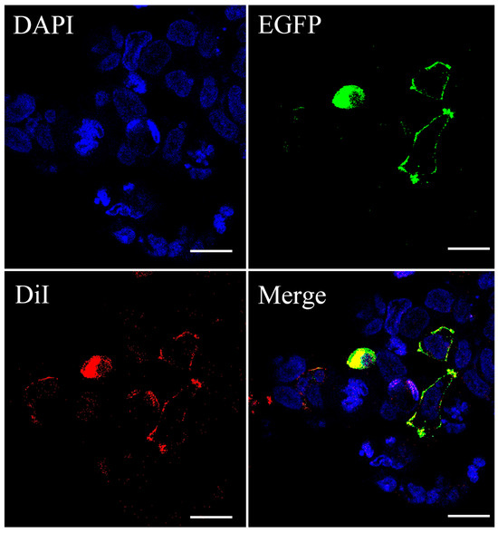 Localization of Sj5-HT6r-EGFP in HEK293 cells. DAPI (blue): nuclear staining; DiI (red): cell membrane staining; EGFP (green): Sj5-HT6r-EGFP fusion protein expression. The scale is 20 μm.