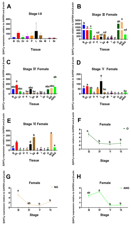 Expressions levels of Sj5-HT6r in female tissues at different stages. (A) Expression levels of Sj5-HT6r in different female tissues at Stage I–II. (B) Expression levels of Sj5-HT6r in different female tissues at Stage III. (C) Expression levels of Sj5-HT6r in different female tissues at Stage IV. (D) Expression levels of Sj5-HT6r in different female tissues at Stage V. (E) Expression levels of Sj5-HT6r in different female tissues at Stage VI. (F) Expression levels of Sj5-HT6r in the ovary at different stages. (G) Expression levels of Sj5-HT6r in the nidamental gland at different stages. (H) Expression levels of Sj5-HT6r in the accessory nidamental gland at different stages. Abbreviations: B, brain; OL, optic lobe; Gi, gill; H, heart; P, pancreas; Sk, skin; L, liver; M, muscle; St, stomach; I, intestine; NG, nidamental gland; OV, ovary; ANG, accessory nidamental gland. The letters (e.g., “a, ab, bc, abc”) above the bars indicate significant differences among groups. Bars sharing the same letter denote no significant difference (p > 0.05), whereas those with different letters represent statistically significant differences (p < 0.05). This analysis was conducted using a post hoc Tukey’s test.