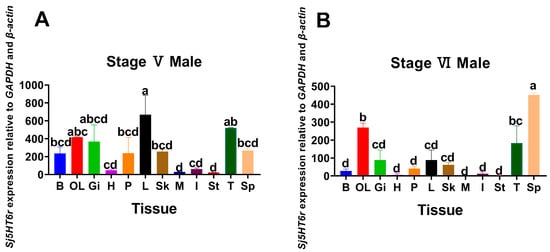 Expressions levels of Sj5-HT6r in male tissues at stages V and VI. (A) Expression levels of Sj5-HT6r in different male tissues at Stage V. (B) Expression levels of Sj5-HT6r in different male tissues at Stage VI. Abbreviations: B, brain; OL, optic lobe; Gi, gill; H, heart; P, pancreas; Sk, skin; L, liver; M, muscle; St, stomach; I, intestine; T, testis; SP, spermatophore. The letters (e.g., “a, ab, bc, abc”) above the bars indicate significant differences among groups. Bars sharing the same letter denote no significant difference (p > 0.05), whereas those with different letters represent statistically significant differences (p < 0.05). This analysis was conducted using a post hoc Tukey’s test.