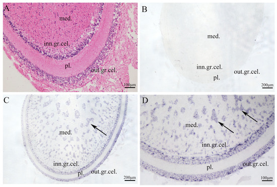 Sj5-HT6r mRNA localization in tissues was assessed by ISH. Figure 7A shows the hematoxylin and eosin (HE) staining results for the optic lobes. ISH results showed that the positive hybridization signals of Sj5-HT6r mRNA could be observed in the optic lobe (Figure 7C,D), compared with the sense probe control experiment without any hybridization signal (Figure 7B). The positive signal was stained blue by NBT/BCIP (Figure 7C,D). Cells with Sj5-HT6r precursor gene mRNA were observed in the central medulla, marginal medulla, inner cell granular layer, and outer cell granular layer of the optic lobes, and there was no positive signal in the plexiform zone (Figure 7C,D).
