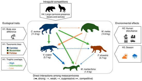 - H4—Spatial and/or temporal overlaps will decrease in the absence of large carnivores (wolves and brown bears, Ursus arctos) because the effects of large-dominant mesocarnivores (i.e., the jackal in our focal species) may increase because of ecological release [2,18]. Consequently, small, subordinate species must segregate spatiotemporal niches from the dominant predator to decline antagonistic encounters [7,20,22].