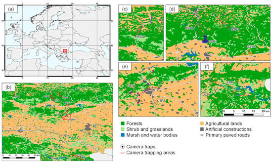Map of the study area, central Bulgaria (represented by a red square; (a)); land cover and locations of eight camera trapping sites (b); and locations of camera traps (c–f).