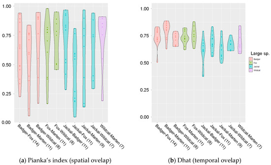 Observed values of (a) Pianka’s index (for spatial overlap) and (b) Dhat (for temporal overlap) in mesocarnivore pairs. Sample sizes of carnivore pairs are given within parentheses. Colored dots represent row data in each pair.