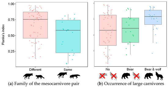 Relationships between Pianka’s index for spatial overlap in mesocarnivore pairs and (a) their family or (b) the occurrence of large carnivores (horizontal line, median; colored bar, quartile range; vertical lines, 1.5-fold ranges of quartile; dots, row data of Pianka’s index in each group).