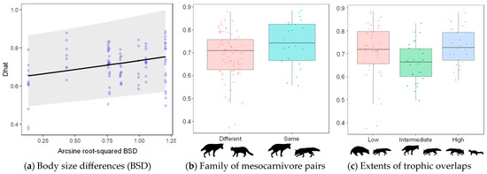 Relationship between Dhat for temporal overlaps of mesocarnivore pairs and (a) their body size differences (shaded area: 95% confidence intervals), (b) family, and (c) extents of trophic competition (horizontal line, median; colored bar, quartile range; vertical lines, 1.5-fold ranges of quartile; dots, row data of Dhat in each group).